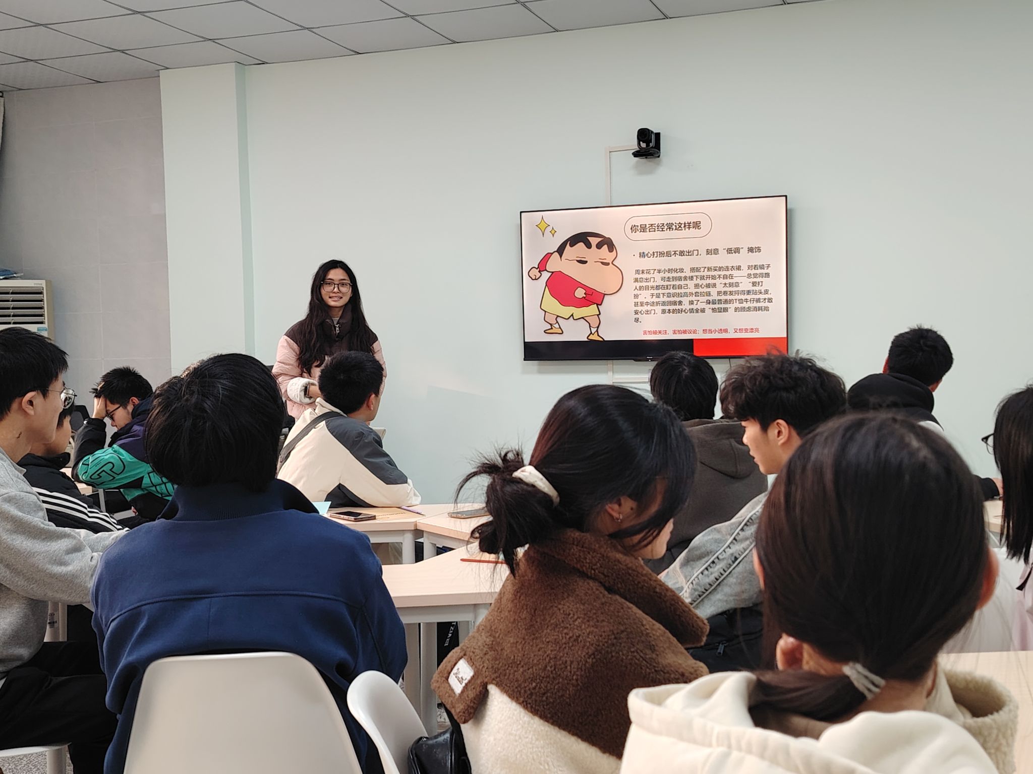 活动开场,主讲人以“穿搭小烦恼”互动引入,邀请同学们分享“因在意他人眼光,不敢穿喜欢的衣服、展现闪光点”的经历,如“精心打扮后刻意低调”“怕议论不敢扎高马尾”,让“美丽羞耻”的校园表现更直观,快速引发共鸣。