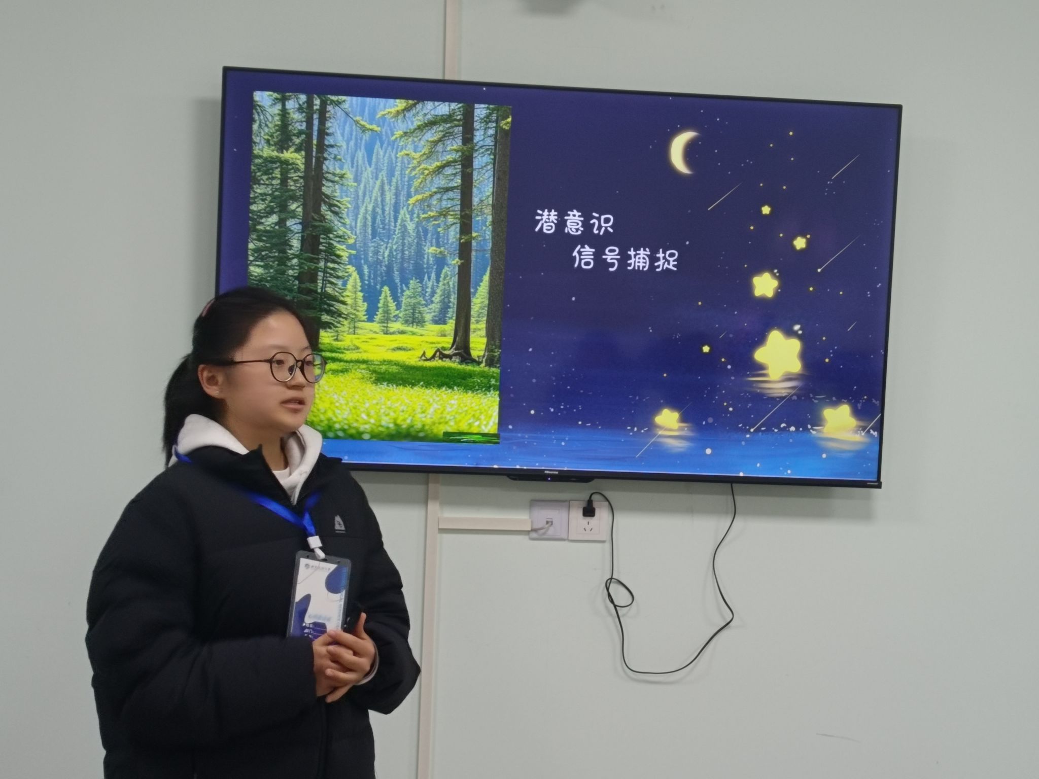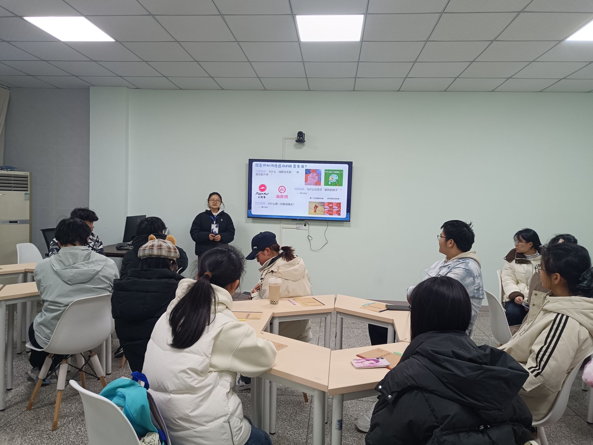 活动伊始,主讲人通过分享生活中常见的决策案例与情绪场景,迅速拉近与同学们的距离,激发大家对“直觉”背后深层原因的探索兴趣,自然引出“潜意识”的核心概念。随后,主讲人用浅显易懂的语言解读定义,通过互动提问让同学们直观感受潜意识的潜在力量。核心环节中,主讲人深入剖析潜意识对学业、人际、情绪的影响,分享“正向认知”锻炼的实用方法。最后,活动在总结升华中落下帷幕,鼓励同学们正视内心需求,运用所学调整个人状态,以从容心态拥抱成长。活动全程秩序井然,氛围热烈,同学们认真聆听、积极思考,在轻松的氛围中收获到实用的心理知识与自我探索技巧。