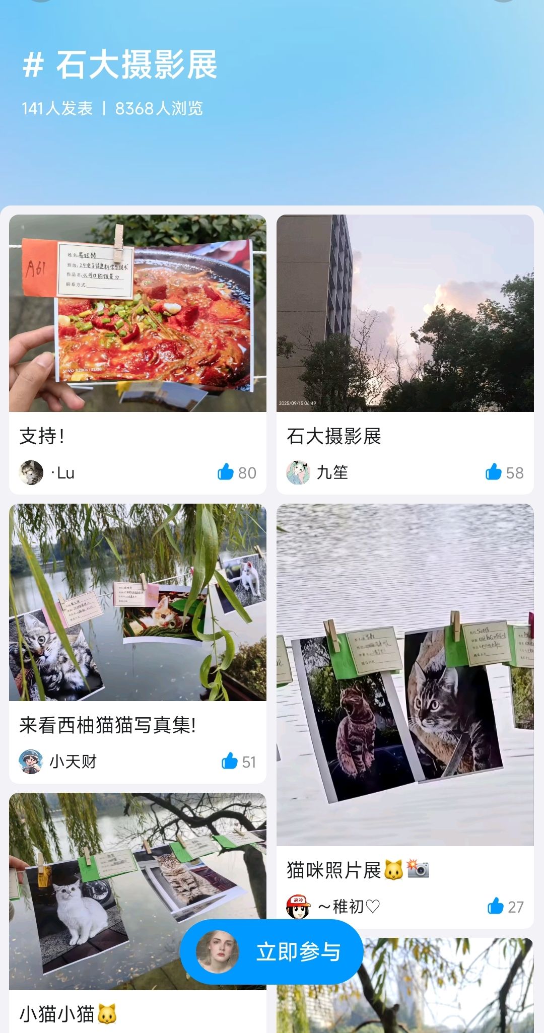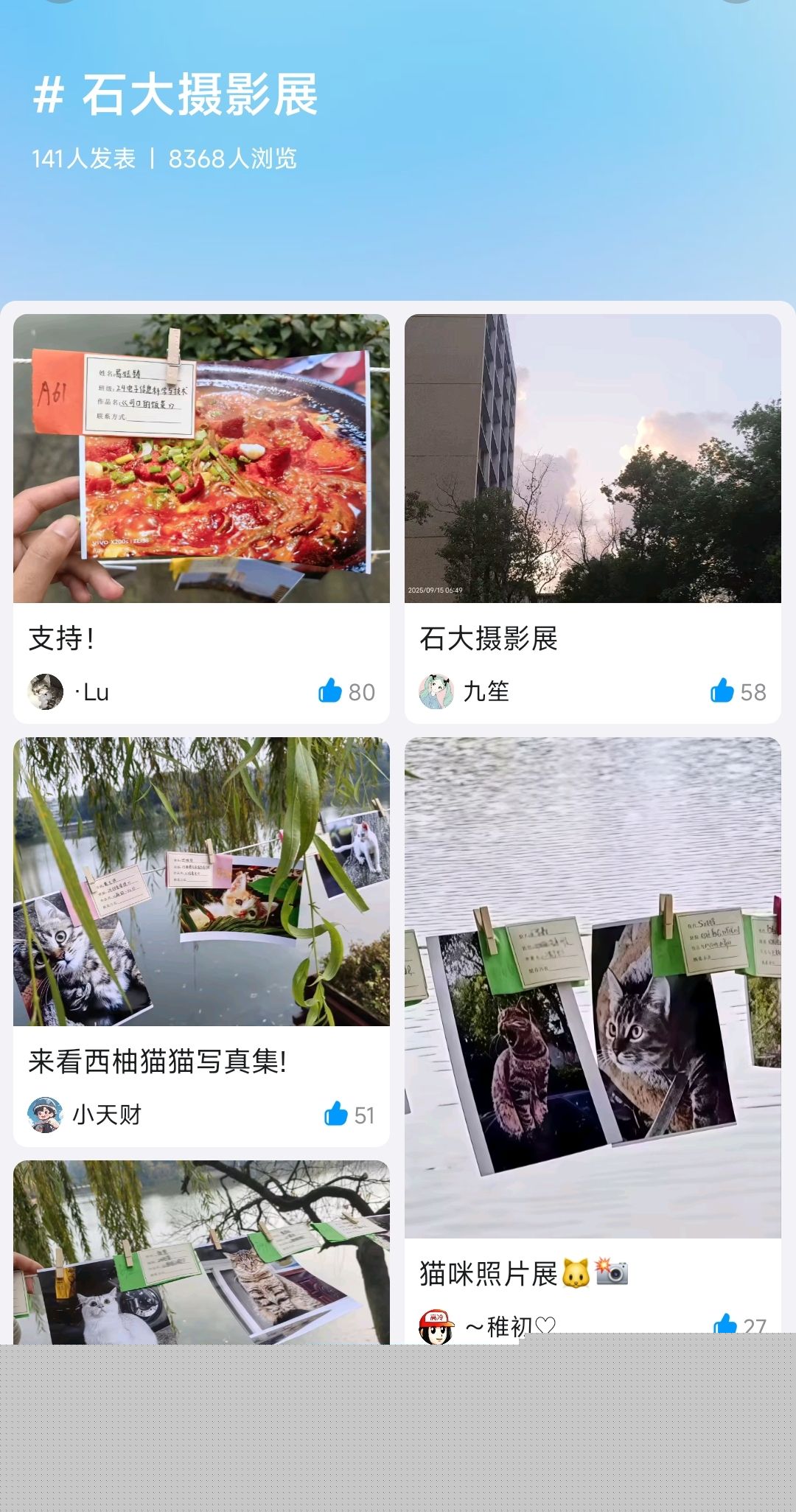 活动前期共征集到全校同学摄影作品1900余幅,分《初见石大的N个瞬间》《“喵”不可言》《“建”证石油》三大主题各精选100幅,以绳夹悬挂方式布展,打造沉浸式光影长廊。展示期间,参与者们以两种形式踊跃互动:一是现场领取便签,写下心仪作品编号投入“最佳人气奖”投票箱;二是在朋友圈或QQ动态发布带“#石大摄影展#”话题图文集赞,前300名集满20赞者获得到梦空间二课分。线上线下联动,吸引多名师生驻足欣赏、拍照打卡。经统计投票及主办方评审,最终评选出一等奖3名、二等奖6名、三等奖9名,并为获奖者颁发证书与奖品。