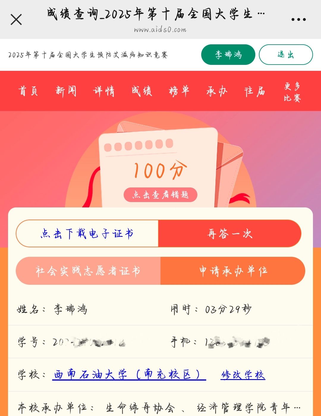 此次线上答题活动以“以赛促学、以知促行”的创新形式,精准向青年群体传递防艾知识,有效提升学生防艾知识水平与自我防护能力。活动引导学生成为红丝带精神的传播者、校园健康的守护者,为构建无艾校园贡献青春力量。
