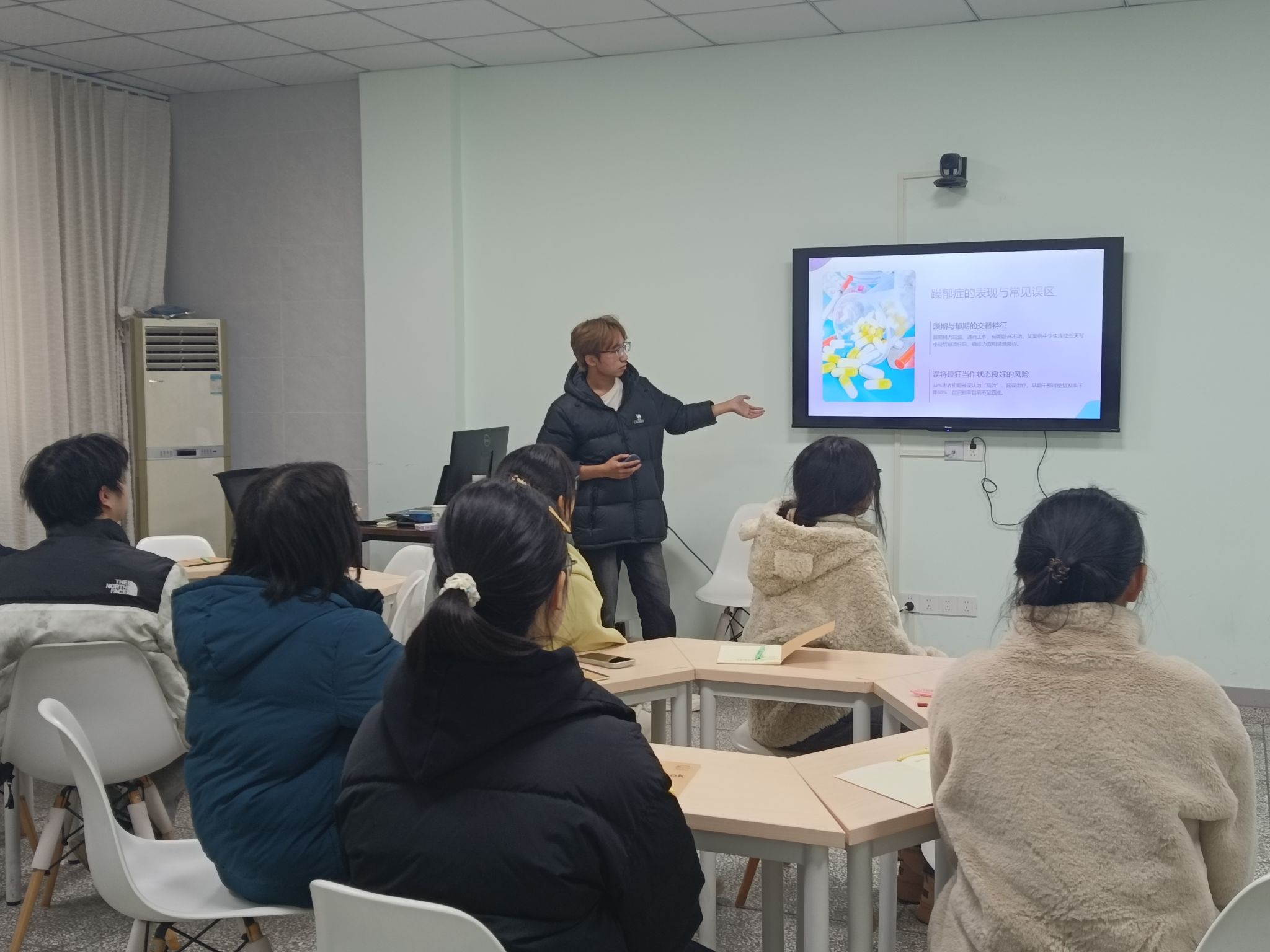 本次小课堂以“普及情绪科学、提升调节能力”为核心,流程紧凑且干货满满。活动伊始,主讲人通过真实校园案例引入,快速拉近与同学们的距离;随后的核心讲解环节里系统地科普了校园常见情绪问题及躯体化表现,穿插趣味问答让专业知识更易理解;最后的实践环节,分享了呼吸放松、认知重构等实用调节方法,让同学们现场交流沟通,在互动中深化学习效果。
