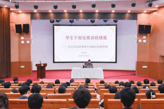 郝江岭以《学生干部也要讲政绩观——从毛泽东政绩观中汲取经验和智慧》为题,围绕“为什么学生干部要讲政绩观”核心命题进行深入阐释。他指出,每个人的言行本质上是与自我的对话,价值观是评判自身行为的内在标尺,而政绩观正是价值观在干事创业中的具体体现,树立正确政绩观,是学生干部践行服务同学初心、扛起青年责任的根本前提。授课过程中,郝江岭结合党史经典案例与校园学生工作实际,系统解读“以人民为中心”“实事求是”“真抓实干”的核心内涵,勉励全体学员摒弃功利心态、力戒形式主义,把工作重心聚焦到解决同学急难愁盼问题上,在服务奉献中锤炼品格、增长才干,努力成为让党放心、让同学满意的青年骨干。