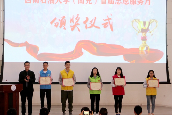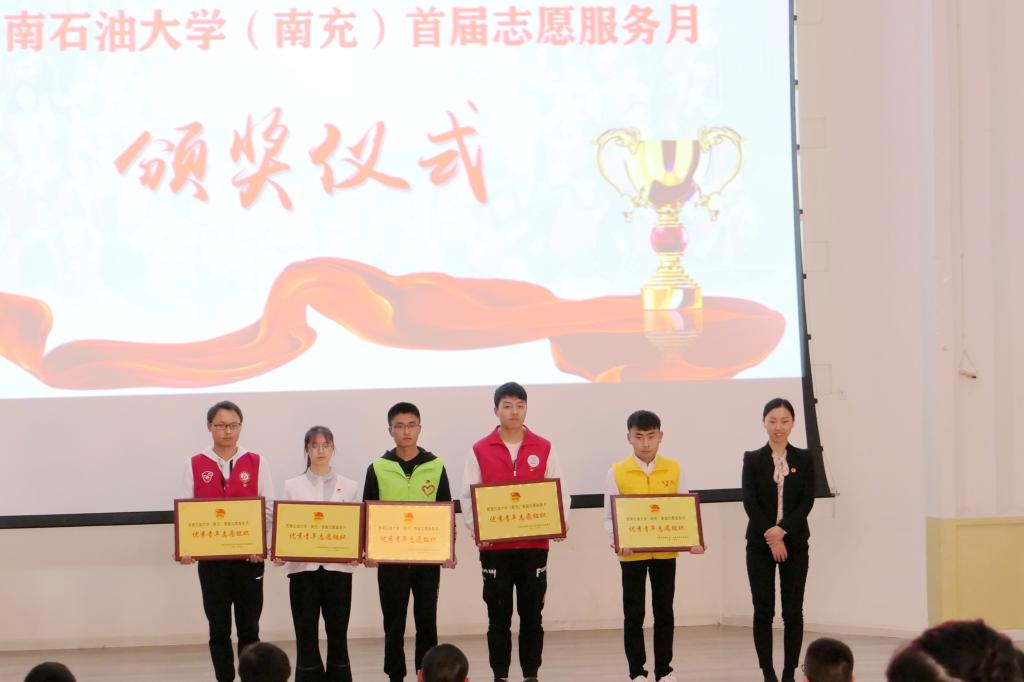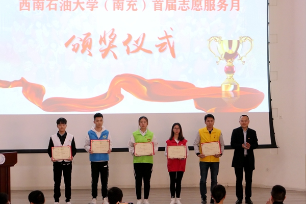 胡文军等27名同学荣获2018年度西南石油大学“优秀志愿者”称号。陈立叶等32名同学荣获本次志愿服务月“优秀青年志愿者”称号。“无毒青春”志愿服务项目、“周末课堂”志愿服务项目、“心佑星娃”志愿服务项目荣获本次志愿服务月“优秀志愿服务项目”称号。工程学院学生会礼仪部、信息学院学生会实践部、财经学院学生会社会活动部、校区社团联合会红协志愿者协会、校区社团联合会青春农子协会荣获“优秀青年志愿组织”称号。与会嘉宾分别为获奖同学颁发了获奖证书。