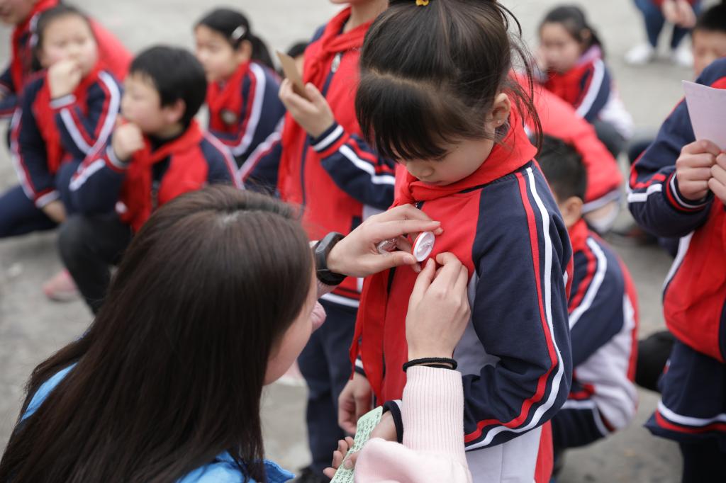 志愿者为小学生佩戴勋章