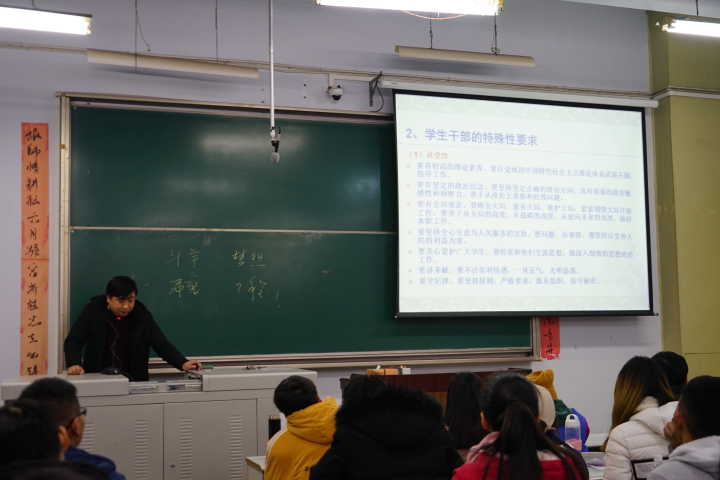 为深入学习习近平新时代中国特色社会主义思想,全面贯彻十九大精神,不断提高学生干部的政治素养和理论知识。2018年12月14日晚上7点,西南石油大学南充校区第二届团校暨青马工程培训第二次课堂讲座——“学生干部应具有的政治素质”于4302教室开展,主讲人为南充校区学生工作部部长郝江岭老师。