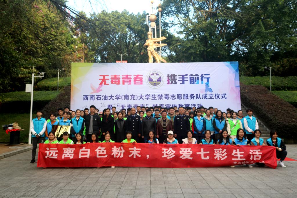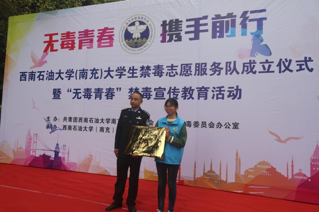 仪式上,郝江岭详细介绍了南充校区开展大学生禁毒教育宣传活动的基本情况。他说,长期以来,南充校区团委以青年志愿者协会为载体,持续开展青少年禁毒防艾宣传等公益活动,并于2018年暑假成立“无毒青春”暑期社会实践队,秉承“服务、奉献、关爱”的精神,开展了形式多样、成效显著的禁毒教育宣传活动,努力让禁毒防毒意识深入每个人的心中,为大家的身体健康和社会和谐稳定贡献了西南石油大学的力量,获得广泛好评。郝江岭表示,南充校区青年志愿者协会禁毒小分队是校区禁毒教育宣传工作的主力军,今天正式成立的南充校区大学生禁毒志愿服务队将接过禁毒小分队的接力棒,继续活跃在校园禁毒教育宣传一线,组织开展更多的校内外各类禁毒宣传教育活动,承担起大学生禁毒教育宣传的重任。希望同学们,敢于承担大学生禁毒教育宣传的使命,坚定“无毒青春”的初心,不辜负校区师生和社会各界人士的期望和信任,引导同学们自觉杜绝毒品的危害。