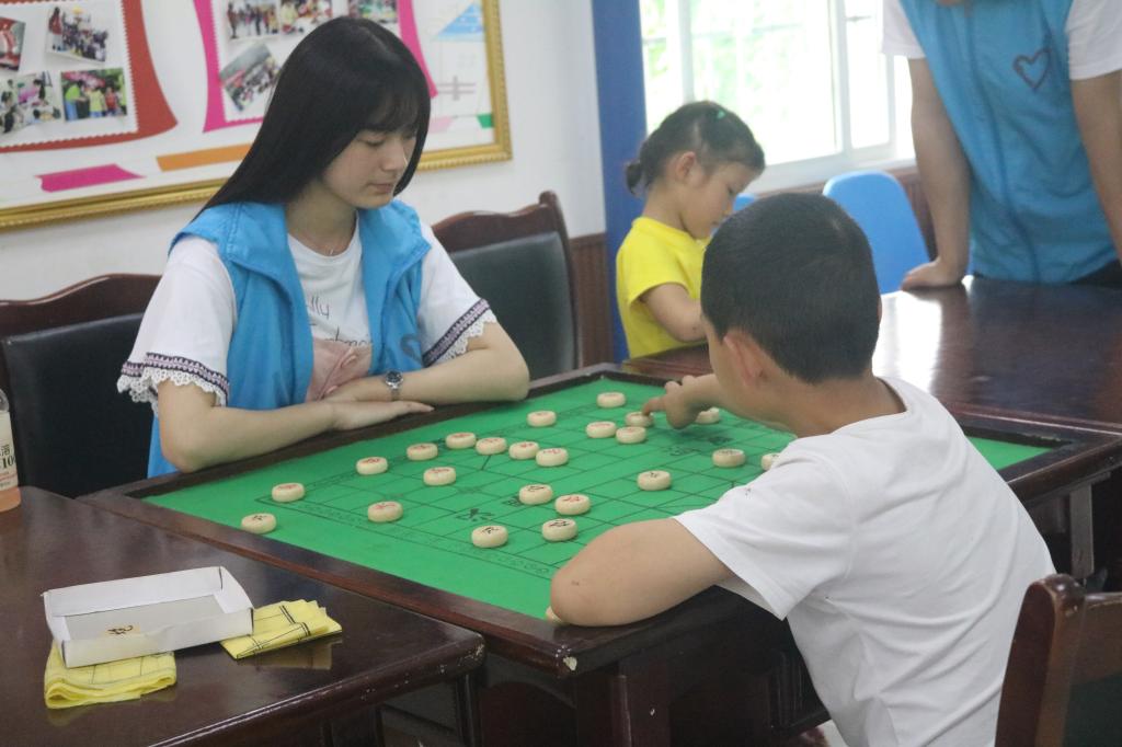 志愿者抵达目的地后,与的小朋友们进行象棋博弈交流。随后,关爱中心的老师和志愿者们带领小朋友开展集体活动。本次活动主题围绕“5.31世界无烟日”,活动分为两个部分。首先是抢答部分,小朋友举手抢答与世界无烟日相关问题,回答正确可获得一个小气球。第二部分,每一位小朋友在志愿者的帮助下完成一幅禁烟宣传画并粘贴留念。之后,志愿者们还带领小朋友拼搭积木,比赛吹气球、叠纸。活动结束后,志愿者们与小朋友合影留念。