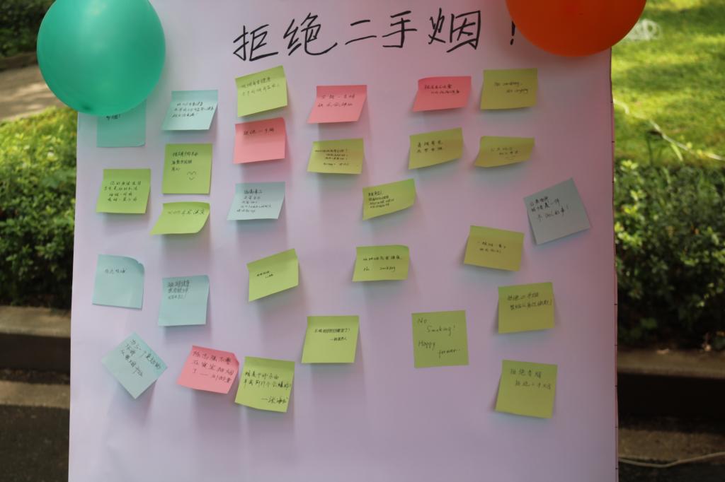 本次活动主要分为禁烟宣言和戒烟行动两部分。活动主办方事先准备好了禁烟倡议书和寄语小卡片,邀请参与活动的同学在禁烟倡议书上签字并拍照留念。同学们还可以在寄语小卡片上写禁烟宣言,倡导周边的同学都能远离香烟、避免香烟的危害。同时,活动的部分工作人员在校园内派发“香烟糖”和相关资料,让同学们用明白香烟对身体的伤害,呼吁同学们可以在想抽烟的时候用“吃糖”代替。活动一开始就吸引了许多同学的参与,同学们纷纷在禁烟倡议书上签上了自己的名字,并且在寄语小卡片上写下了许多关于禁烟的宣言和感想并贴在了展览板上。活动现场都贴上了一些文明标语,贴满同学们禁烟宣言和感想的展板也被摆在了显眼的位置,让来往的同学都可以看见这些有趣的标语,时刻提醒自己香烟的危害性。