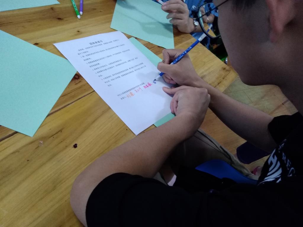 本次活动以“萍水相逢”为主题,吴静老师首先让小组成员思考作为班级心理委员的困惑是什么,在本次团体活动中对小组及自己有什么样的期待。之后通过“握手达人”、“滚雪球”、“我的标志性造型”等活动带领成员互动,并初步相识。在“自制胸牌”的过程中,通过绘画和设计,小组成员再一次思考了对自身的认识并相互分享。随后在“天使之翼”活动中,每位同学都在百宝箱里抽取了一张写有团队成员姓名的纸条,在接下来的日子里将会默默的守护他,鼓励他、欣赏他、帮助他。最后,在吴静老师的启发下,大家讨论制定并签署了团体承诺书。