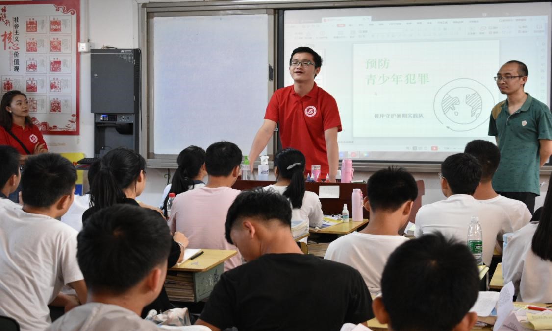 郭老师带领队员们来到了高二三班教室。实践队队员罗中为高中同学们讲述了许多青少年犯罪的实际案例,郭老师讲解了有关青少年犯罪的法律知识,最后实践队唐凤莲同学总结收尾,希望同学们知法守法,努力学习。