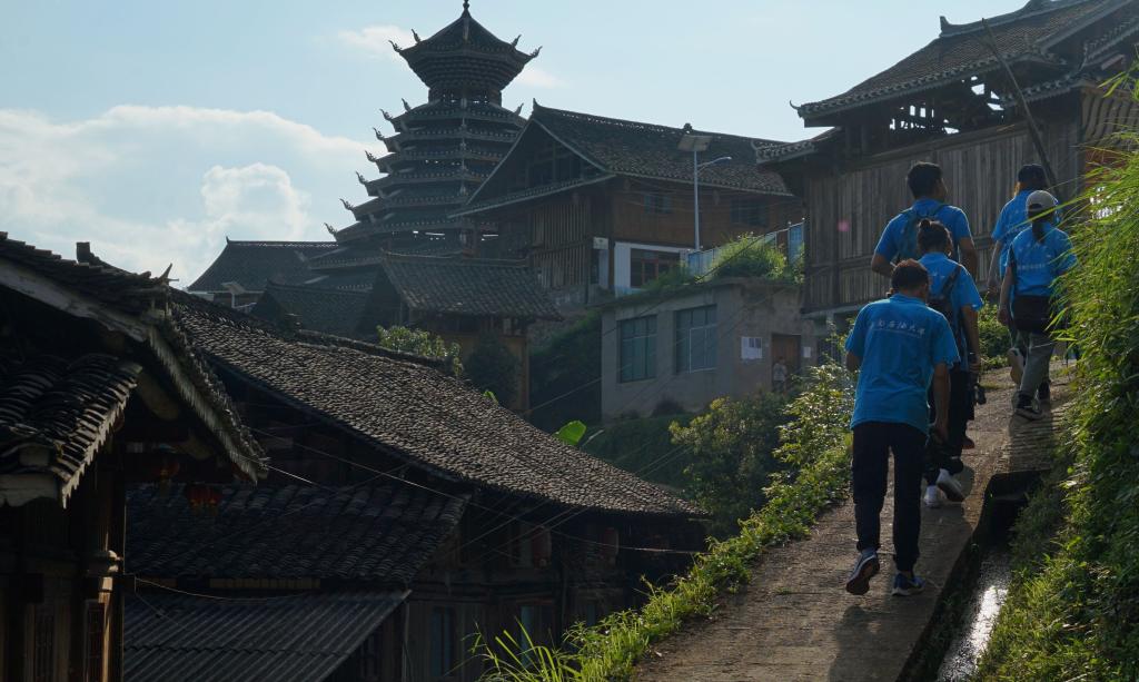 在当地的驻村干部吴双福的带领下队员们参观了侗族具有代表性的建筑鼓楼、风雨桥、戏台和寨门。吴双福向队员们讲述到所有的侗族人的房屋都是依山而建,大多都是三层吊脚楼设计彼此之间十分紧密,也正体现着侗族人无论面对什么样的困难都是齐心协力,一起面对的精神。