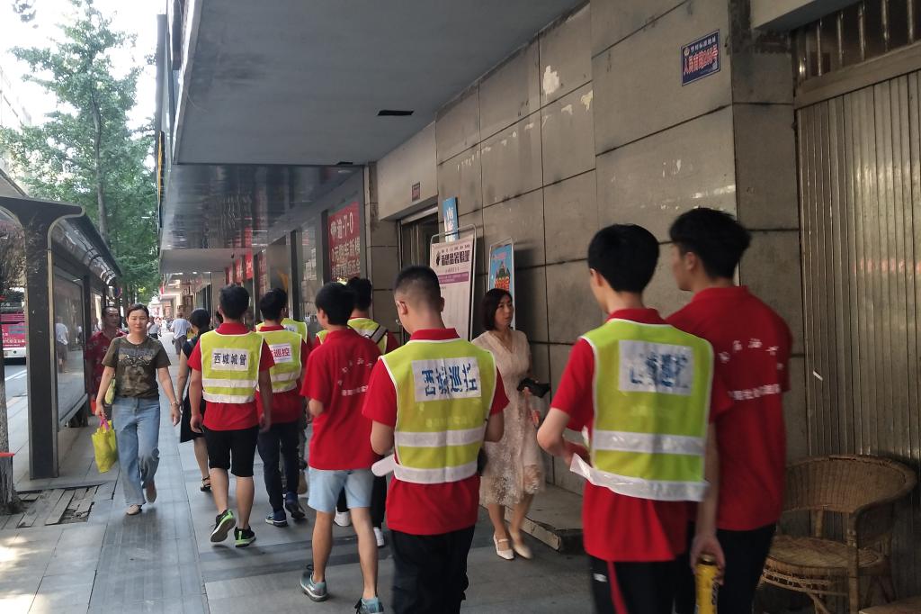 参与社区工作时,实践队分为两支小队,分别参与不同的社区工作。一队跟随社区工作人员巡逻小西街。队员们对街道上商贩的不规范行为进行劝导,并整理好共享单车等公共设施,保持街道的干净整洁。二队在社区内分发关于“党政廉风建设”及升级社保卡的传单,认真听取社区居民建议的同时解答社区居民关于这方面的问题,努力提高社区居民对政府工作参与感和社区归属感。在参与社区工作的同时,队员们也通过居民了解到一些关于社区的变化和改变。