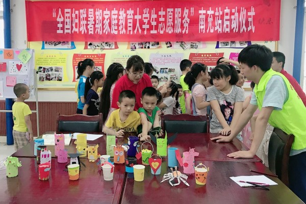 A、B两队在南充市嘉陵区妇联协会叶主任的带领下,携手北京航空航天大学的志愿者共同开启了“全国妇联暑期家庭教育大学生志愿服务”南充站启动仪式。活动过程中,A队成员向孩子们展示了如何将废旧的矿泉水瓶、易拉罐以及一次性纸杯等东西变废为宝。鼓励孩子们循环利用身边的资源。B队的实践队员们则主要通过环保知识ppt的讲解、环保互动小游戏以及观看童趣视频等方式,来引导小朋友们自觉培养环保意识。