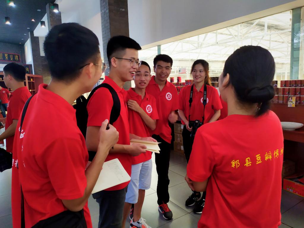 豆瓣博物馆主要展出的是豆瓣的文物原件、生产流程、制作现场,以及清代民国豆瓣店铺三大主题等相关内容。在与工作人员的交谈中,队员们得知战旗村已有3家豆瓣厂,为当地村民提供了大量的就业机会,有力的推动了当地的经济发展。2018年建成的“满江红郫县豆瓣”博物馆,以文化展示的方式带动当地旅游业的发展,从而形成战旗村特色“农商文旅”融合发展模式。随后在工作人员的带领下,实践队员们参观了利用现代信息技术改善后的传统豆瓣酱制作园区。