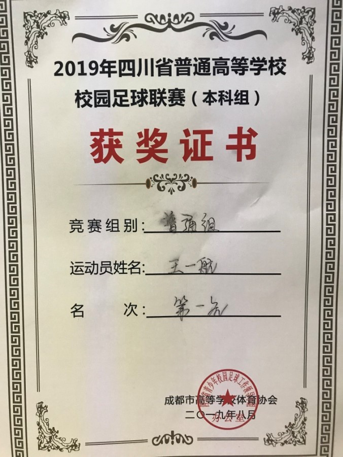 8月29日,2019年四川省大学生足球联赛在我校成都校区落下帷幕,基础教学部体育教研室杨哲瀚指导的校区学生足球队队员王一航代表我校参加了比赛,荣获金球奖和铜靴奖。