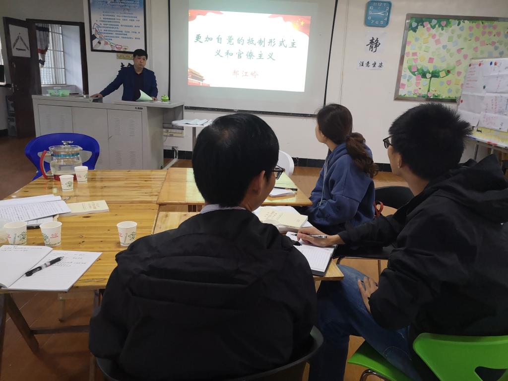 郝江岭从形式主义和官僚主义与我们党格格不入讲起,分享了党的历代中央领导集体领导全党开展的反对形式主义和官僚主义的重要活动,突出强调了形式主义和官僚主义违反了马克思主义的辩证唯物主义和历史唯物主义,与我们党的性质、宗旨、初心和使命是完全背离的,形式主义和官僚主义严重侵害党的执政基础,需要我们自觉抵制。之后他和支部成员一起学习了老一辈无产阶级革命家和党的十八大以来对形式主义和官僚主义表现形式的论述,让大家更加清醒的理解了在实际工作中可能自觉或不自觉的会出现的形式主义和官僚主义的表现,从而进一步增强了自觉抵制形式主义和官僚主义的自觉。最后他和支部成员一起探讨了如何更加自觉地抵制形式主义和官僚主义。