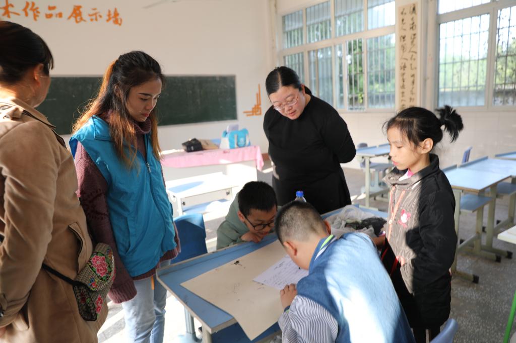 校区“益起来,艺起爱”大学生关爱留守儿童志愿服务队共十名成员,其中五名队员固定专门负责唱歌、跳舞、绘画和书法这四类艺术表演,并提供高质量、较专业的艺术教学。本次艺术课堂前期准备过程中,志愿者们首先与孩子一起对课堂环境进行了美化,并进行了打扫工作。接着,志愿者和当地小朋友提前接触并处理了艺术课堂报名等相关事项,动员小朋友们在报名册上写下他们期待已久的课程名称。报名册一份份地堆叠起来,而小朋友那一双双渴望的眼睛也无不透露着欣喜。