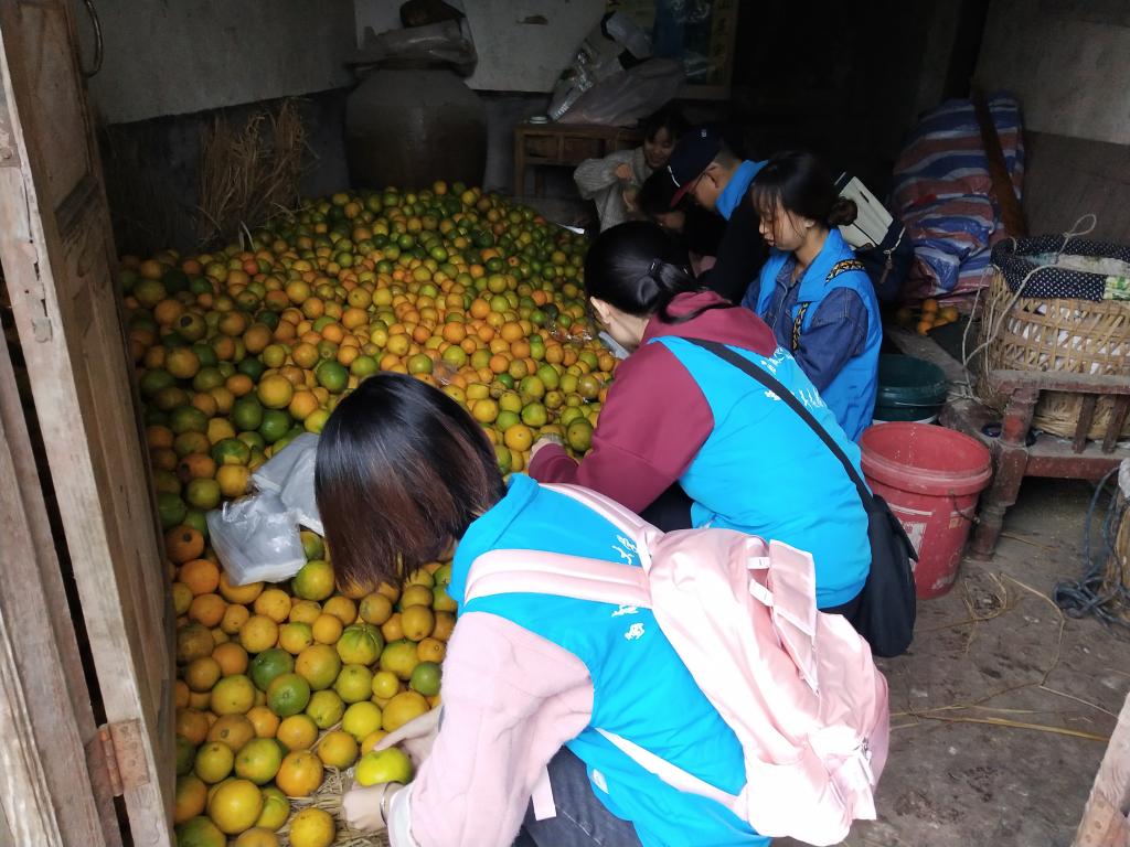 志愿者帮助农民给柑橘套袋
