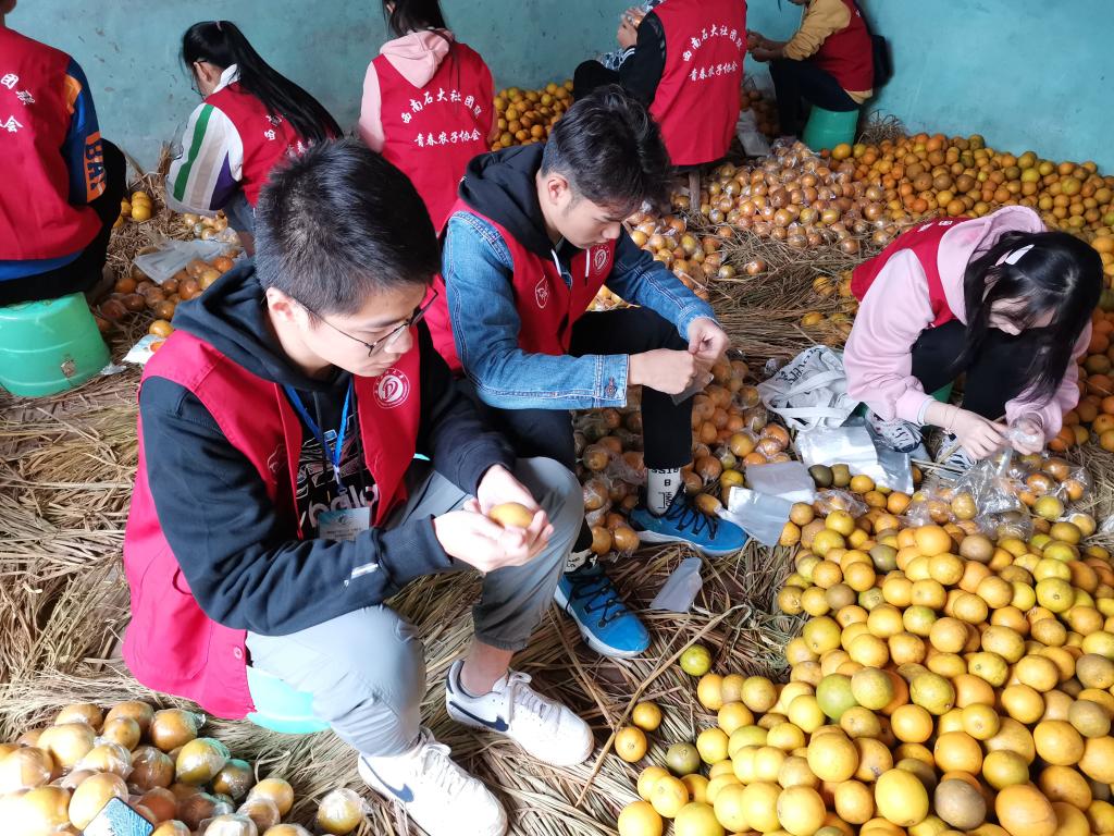 志愿者帮助农民包装橘子