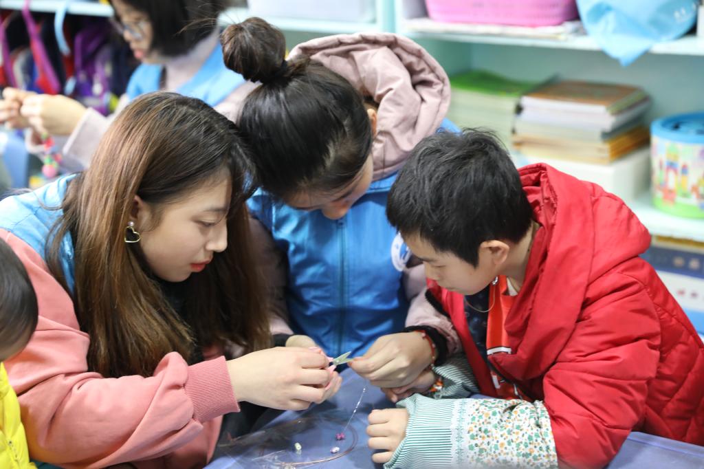 志愿者们和小朋友一起串珠