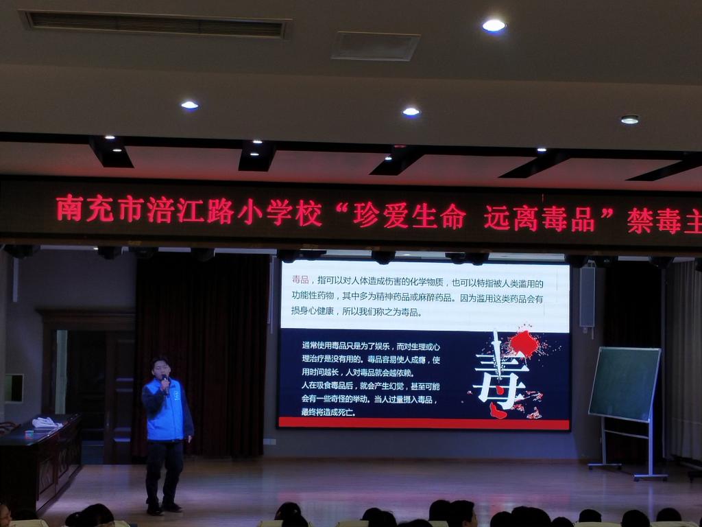 为加强小学生对毒品危害的认识,增强自我保护意识,校区团委学生会青志协禁毒服务志愿队在11月22日下午来到南充市涪江路小学,开展了以“珍爱生命,远离毒品”为主题的班会活动。