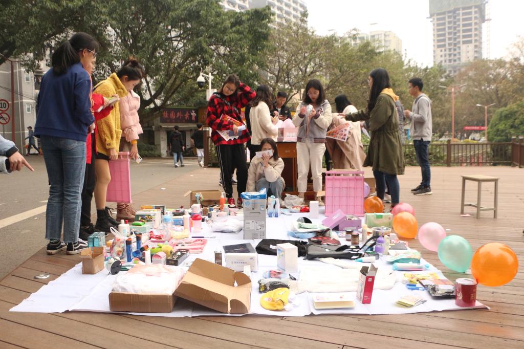 活动中,协会理事将学生交付协会托卖的物品有序摆放好,并标注合理的价格,其中包括一些闲置生活用品、课程参考资料、文学杂志、玩偶、饰品、生活用品等。工作人员分为两组,一组在跳蚤市场咨询处负责同学们的跳蚤市场商品信息的搜索和维持会场秩序,另一组充当销售员,为同学们推销介绍物品,使他们能高效快速地找到想要买的东西。活动进行一小时后,销售接近尾声,全体活动参与者在龙井湖观景台合影留念。活动结束后,工作人员对此次活动售出物品的名称、数量、价格、利润进行计算整理,并将未售出的物品归还原主。