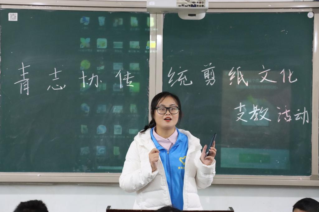 为加强艺术基础教育,丰富学生学习生活。11月28日下午,校区团委学生会青年志愿者协会志愿者前往南充市舞凤第二小学,开展了主题为“传统剪纸文化”的艺术课堂班会。