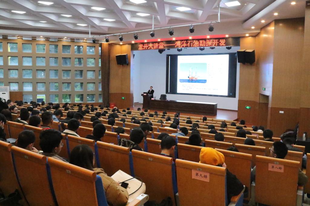 曹明辉分别从海洋常识、海洋石油勘探的必要性、海洋石油勘探的主流装备、主流装备的建造与施工作业、海域边界划分的认识及我国海洋油气开发现状六个部分,向师生介绍了中国石油勘探专业领域取得的成就和遇到的困难。