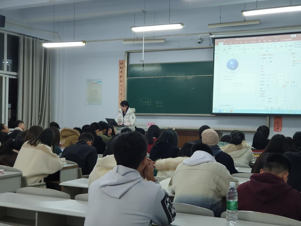 首先,张玉利老师询问了同学们对OFFICE软件的了解情况,并点出办公软件在工作和生活中的重要性和必要性。随后,张玉利老师就软件的校内下载安装,文档的编辑处理,以及数据的分析三个方面展开本次授课,并亲自操作,向同学们依次讲述了菜单栏各种选项卡的具体操作方法和相关技巧。张玉利老师指出,熟练的掌握操作流程是学习和运用OFFICE软件的必要条件。紧接着,张玉利老师以“三下乡实践报告”“顺丰快递年会报告”等典型的PPT演示文稿为例,讲解了PPT制作过程中的相关注意事项,并表示希望这次培训讲座能让大家听有所感,学有所获。