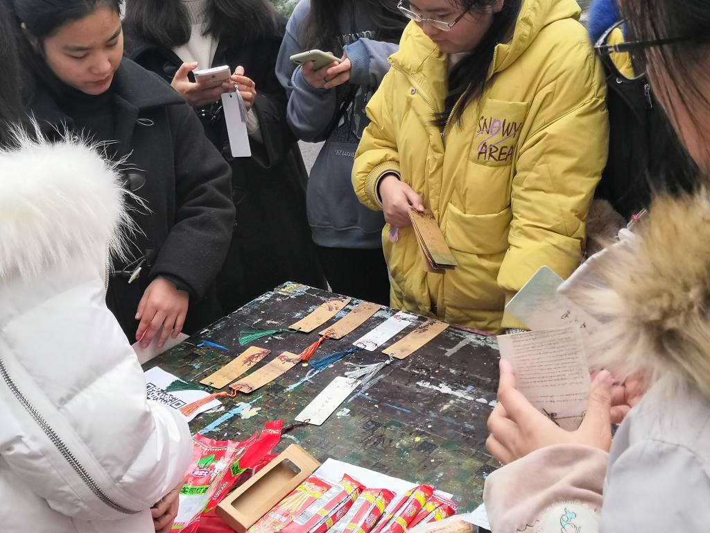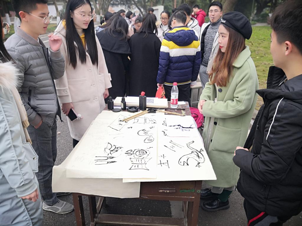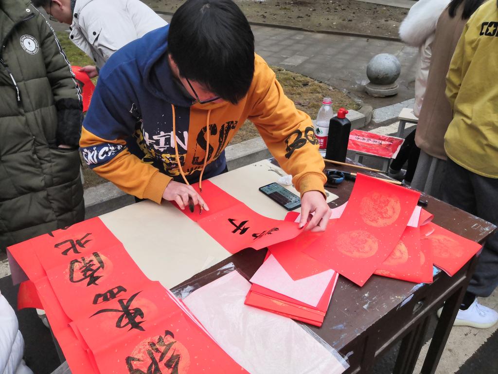 为了让同学了解书画的魅力,丰富大学生日常生活,让书画传统文化深入人心,充分挖掘大学生的艺术智力,提高大学生内涵和艺术造诣,12月15日下午,校区团委社团联合会兰亭墨本书画协会“笔墨凝书香,春联进万家”活动在外语村外顺利开展。