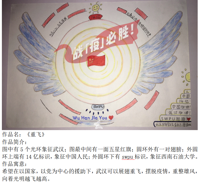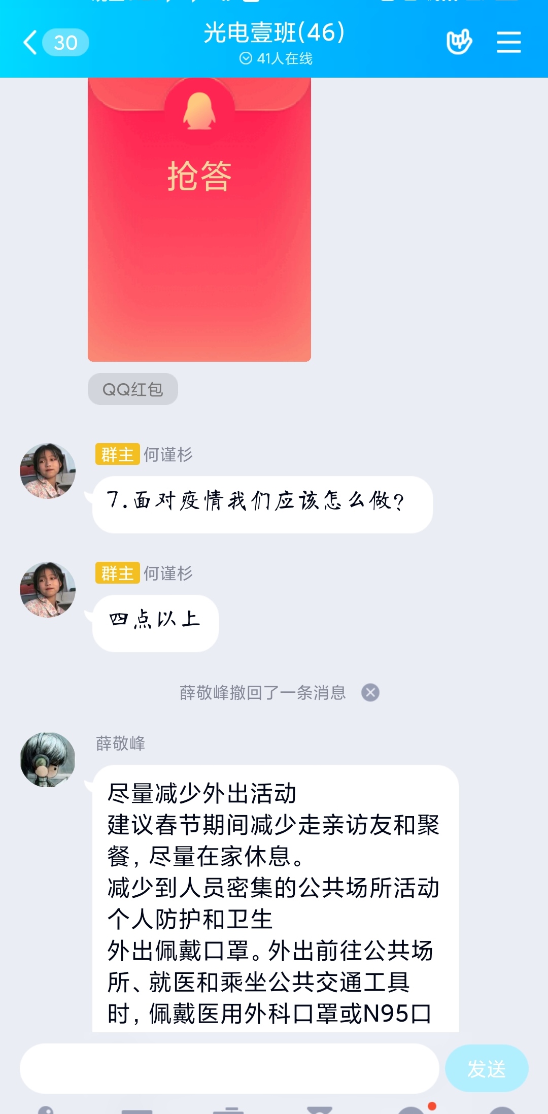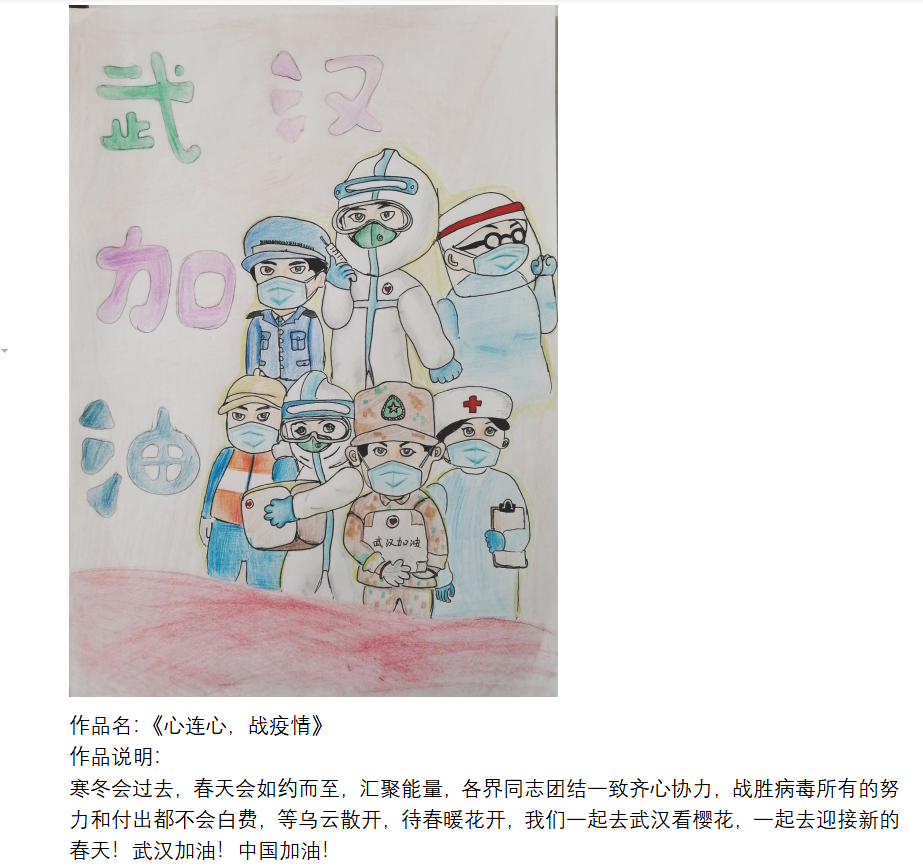 2019年12月,新型冠状病毒蔓延开来,举国上下都加入到了这场人民战“疫”中,作为大学生,也应该行动起来。在线上,团支书通过对新冠肺炎的讲解,大家了解到冠状病毒的来源、传播媒介以及传播方式;通过对抗“疫”一线工作者的事迹分享,同学们感受到中国人在面对疫情的团结与担当。同时,本次团日活动一班佘屹同学分享了自己在志愿服务期间的感受和感想,并告诉同学们:“疫情期间需要做好个人防护,少出门,勤洗手。”同时,为活跃团会氛围,本次团日活动也设置了问题抢答环节,通过抢答领红包的方式,增加了活动的趣味性,让同学们了解防疫知识,加强防范意识。在线下,光电信息科学与工程专业一班的杨洪杰和陈鸣同学,用绘画的形式传达出了自己的祝愿。二班团支书杜菲还收集了同学们的抗“疫”宣言,做成了视频,以传递正能量。
