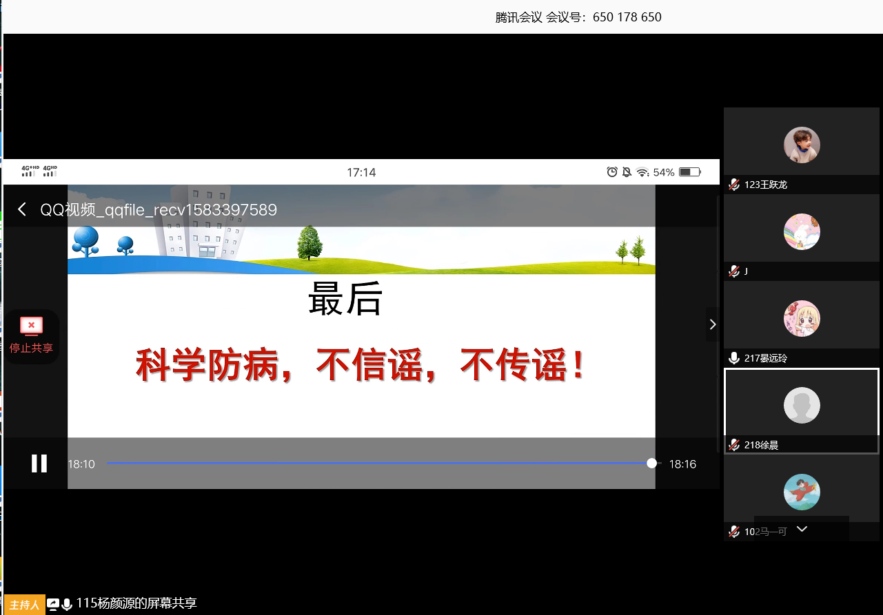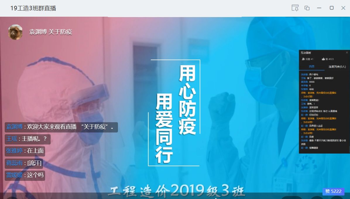 班会上,各位辅导员对心理发展与服务中心制作的《用心防疫用爱同行》PPT进行了讲解,强调在疫情期间要做好自我心理调适,保持积极良好的心态。随后分享了校医院录制的新型冠状肺炎防控视频,从疫情来源、传播途径、诊断与预后、防控措施四个方面向同学们进行了科普。各位老师倡导同学们勤洗手,出门戴口罩,勤开窗通风,少去人员密集的场所,以及做好家人的健康教育。同时鼓励同学们在家期间保持健康的生活方式,合理膳食、加强锻炼。