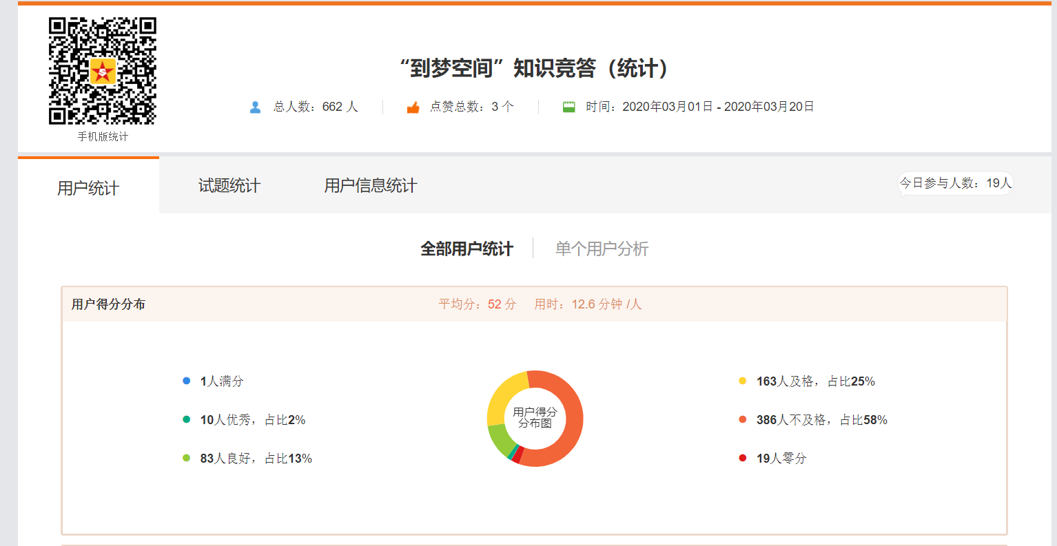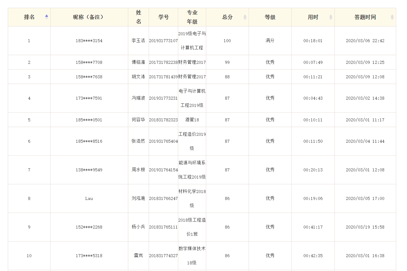 活动采取竞赛形式,参与者通过线上试卷答题,最终由系统评分排名。本次知识竞答设置判断题、单选题、多选题共45道题,主要围绕到梦空间APP的使用、发布活动的相关流程以及黑名单的注意事项等方面展开。知识竞答参与总人数达到662人,其中1人满分,10人优秀,占比2%;83人良好,占比13%;163人及格,占比25%。最终评选出一等奖1名,获奖者为2019级电子与计算机工程李玉洁;二等奖2名,获奖者为2017级财务管理傅铭湄、2017级财务管理胡文涛;三等奖3名,获奖者为2019级电子与计算机工程冯瑞波、2018级酒店管理何容华、2019级工程造价张浩然。
