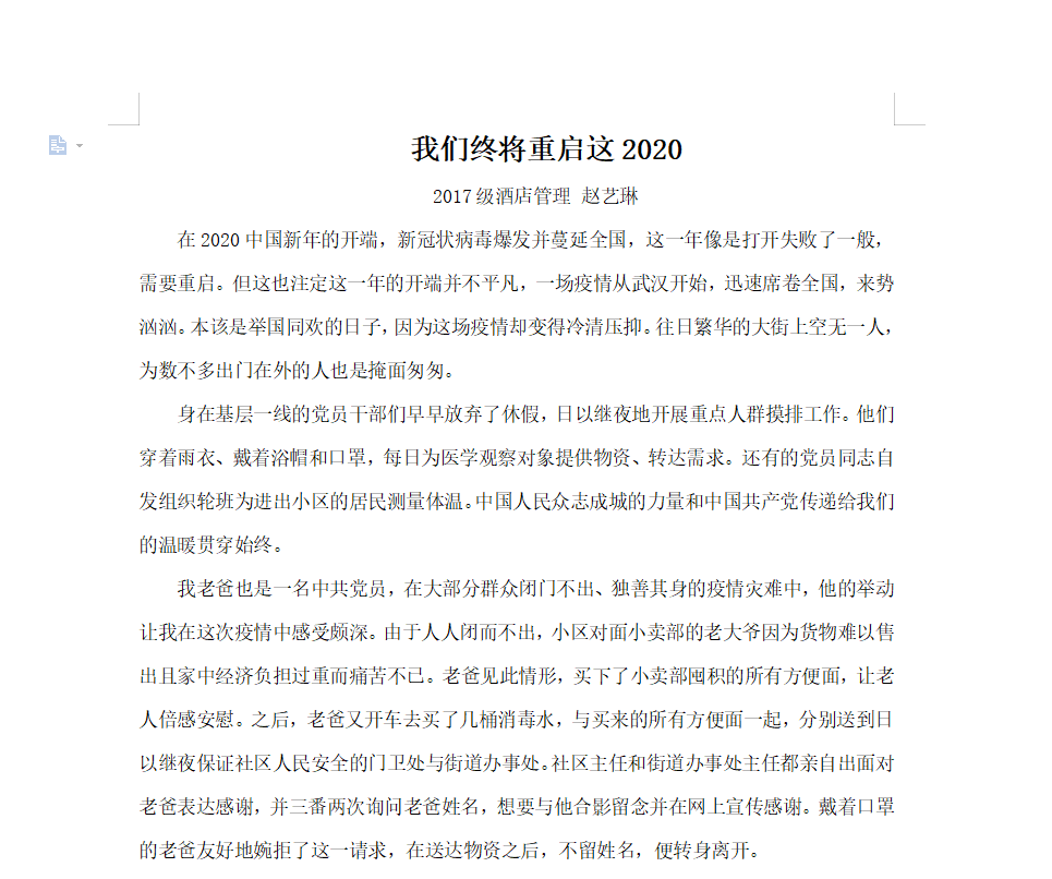 此次活动包含征集参赛文章和理事评选两个部分,同学们直接投稿至活动主办方邮箱即可参与活动。各专业同学踊跃报名、认真对待。活动中,主办方总共收到了34篇征文。文章内容丰富、情感表达真挚,充分展现了同学们对战胜新冠疫情的坚定决心和必胜信念。线上征集完成后,协会会长组织各理事对投稿文章进行评选,最终评选出三篇优秀作品,投稿者分别为17级酒店管理赵艺琳同学、19级电气工程与智能控制昌千琳同学及19财务管理罗湘仪同学。