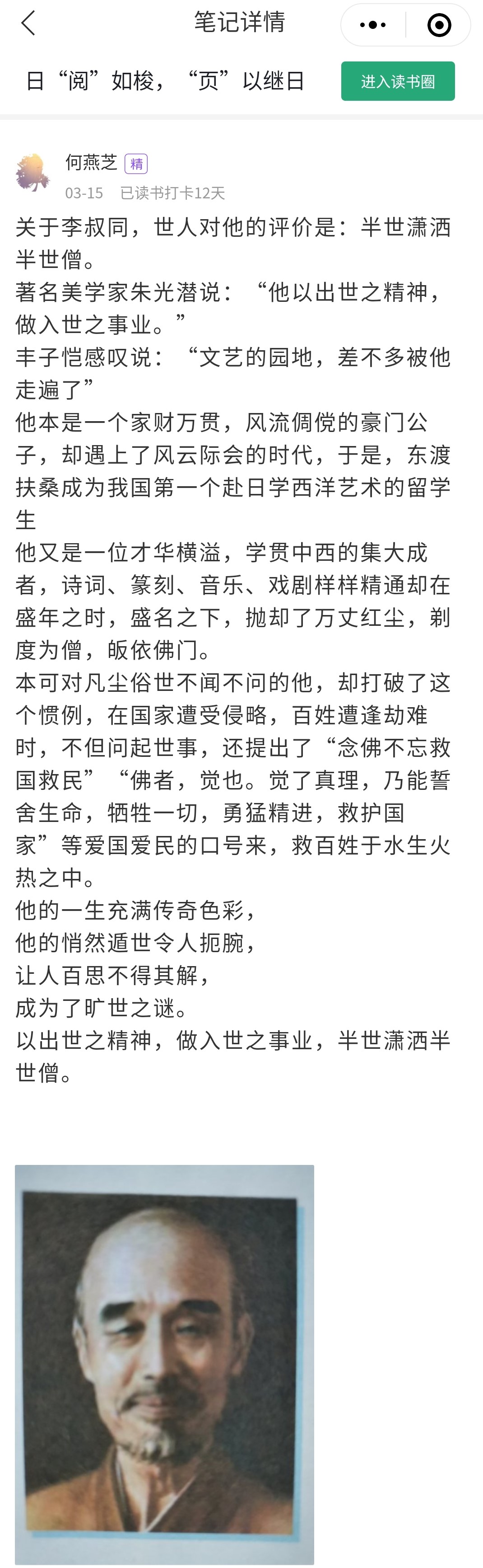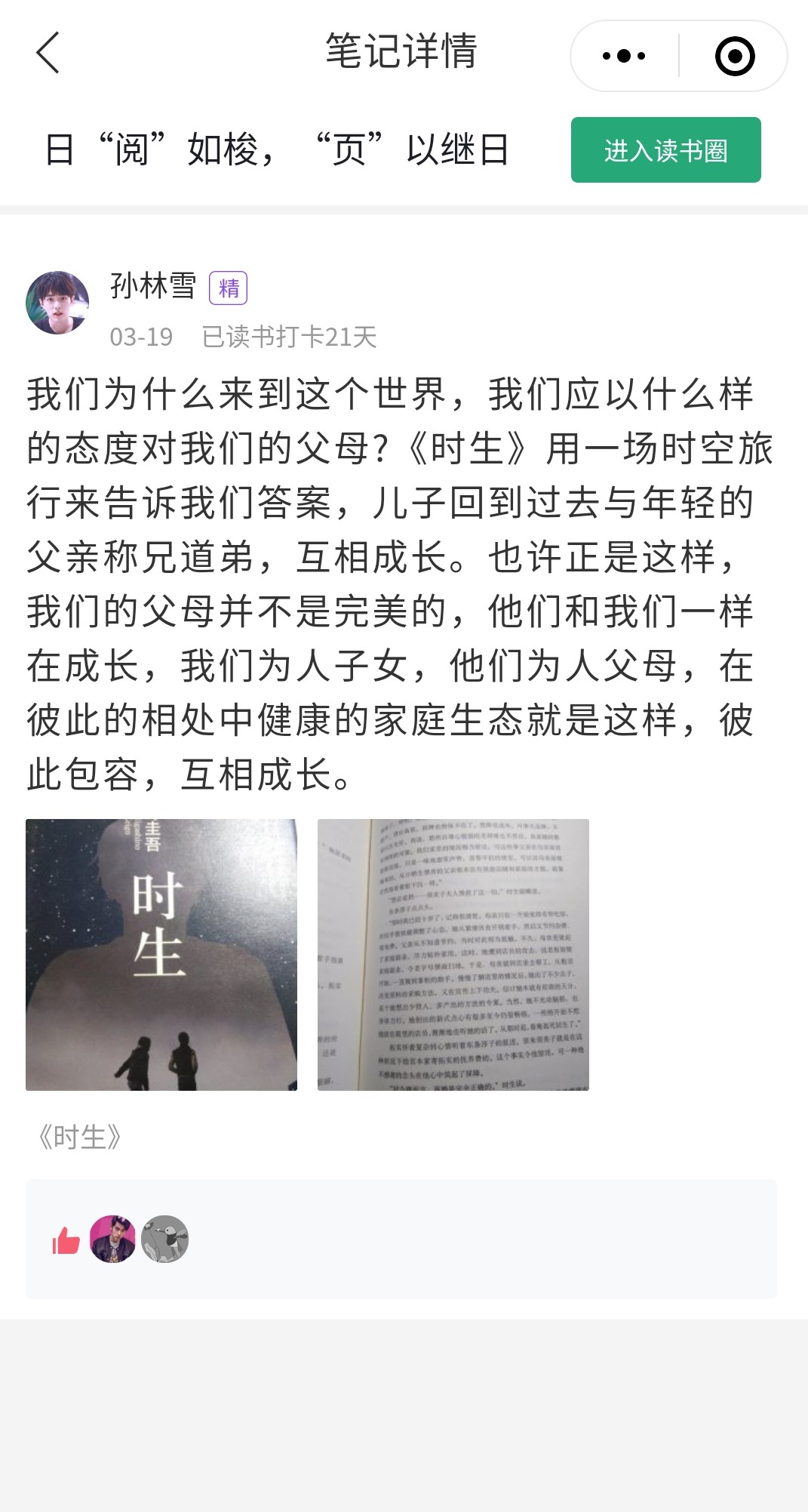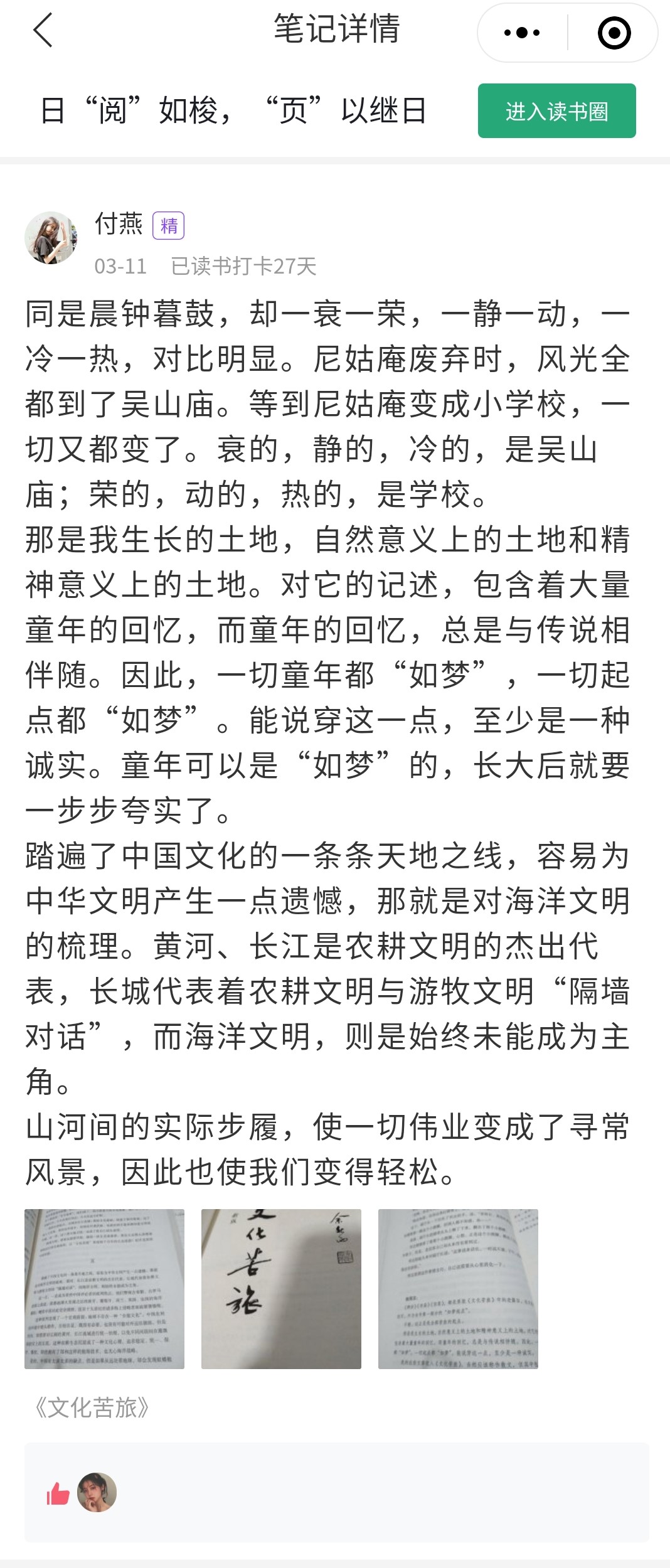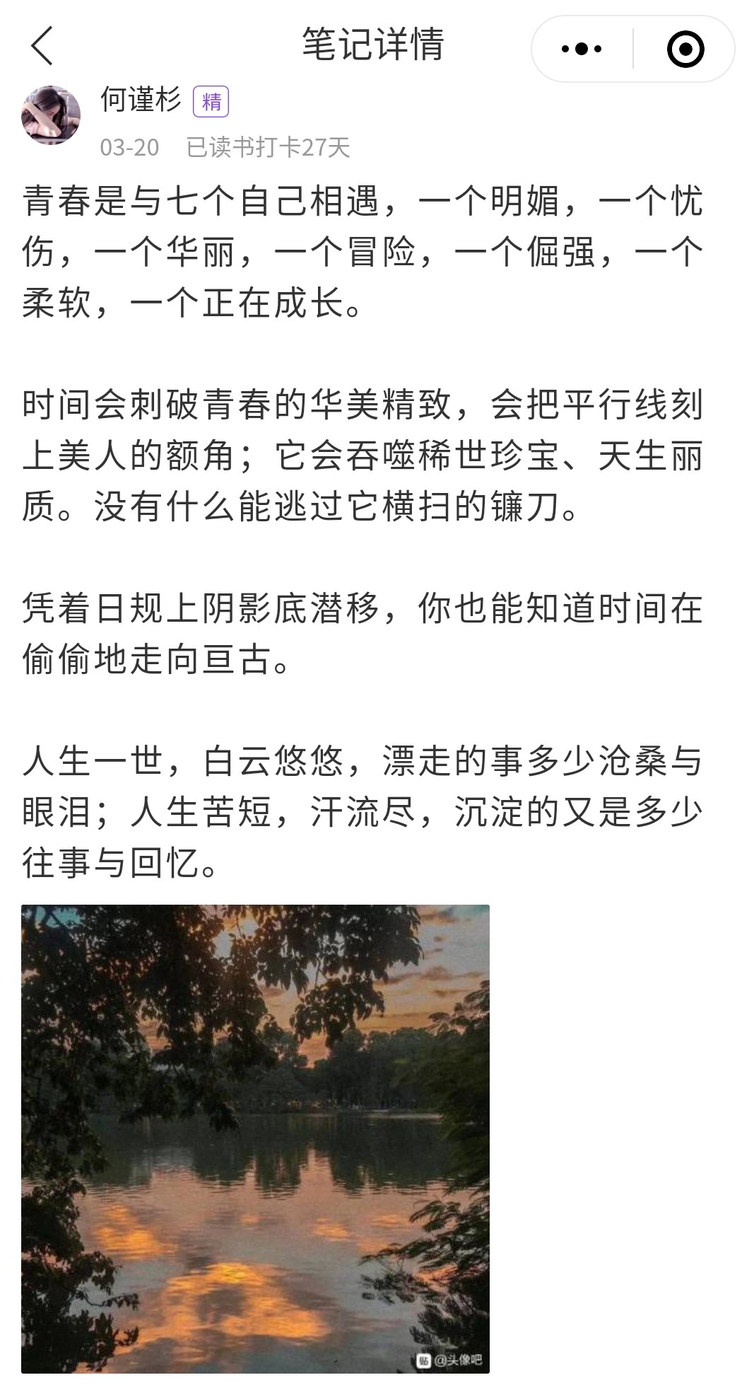 此次活动依托微信小程序“全民读书打卡”平台开展,主办方建立读书打卡圈,参与者可以将美文段落或读书感悟以图片的形式上传至读书打卡圈中参与活动。活动负责人每晚都会挑选出“今日精选”书评发在读书打卡群里供同学们欣赏,积极鼓励同学坚持打卡,增进交流。阅读感想以备忘录、便签、手写笔记等多种形式呈现,有的书评洋洋洒洒感触良多,有的寥寥几句却见解独到。随着线上书评的发出,陆续有同学在读书圈里留言点赞,参与者互相交流、共同感悟,活动氛围良好。