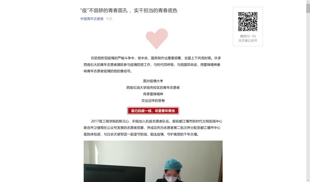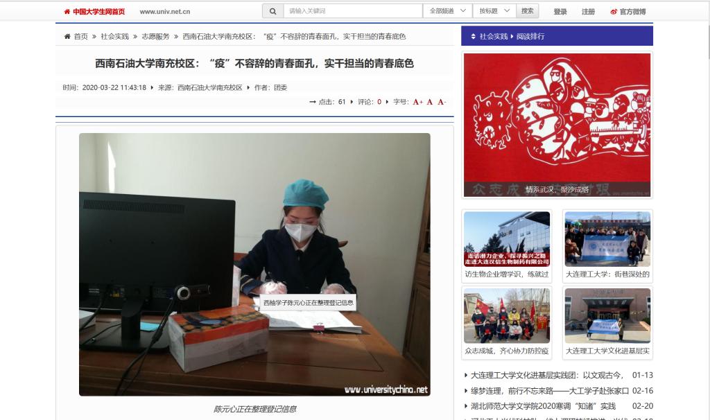 近日,中国青年网、中国青年志愿者等多家媒体多次对校区青年志愿者抗疫防疫事迹进行了报道,共计10篇。