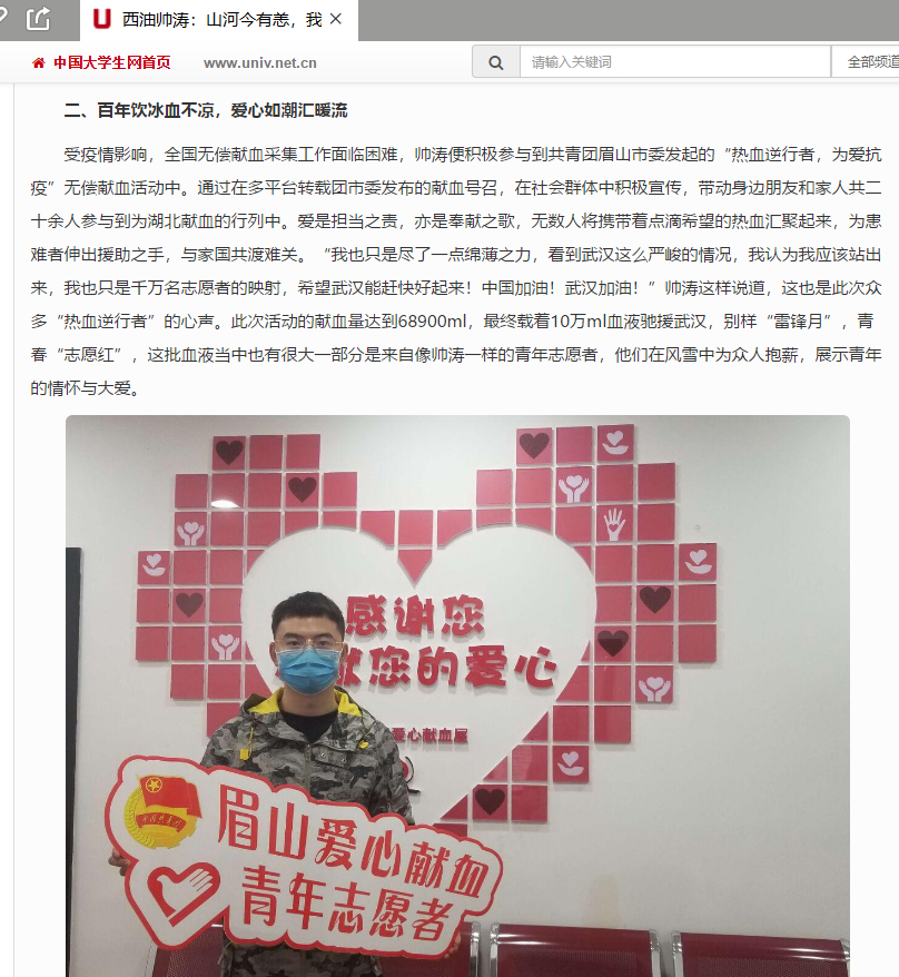 近日,中国青年志愿者协会、四川青年志愿者协会、中国大学生网等媒体平台以《山河今有恙,我定勇为“疫”路先锋》为题,重点报道了南充校区青年大学生帅涛投身疫情防控志愿服务工作的先进事迹。