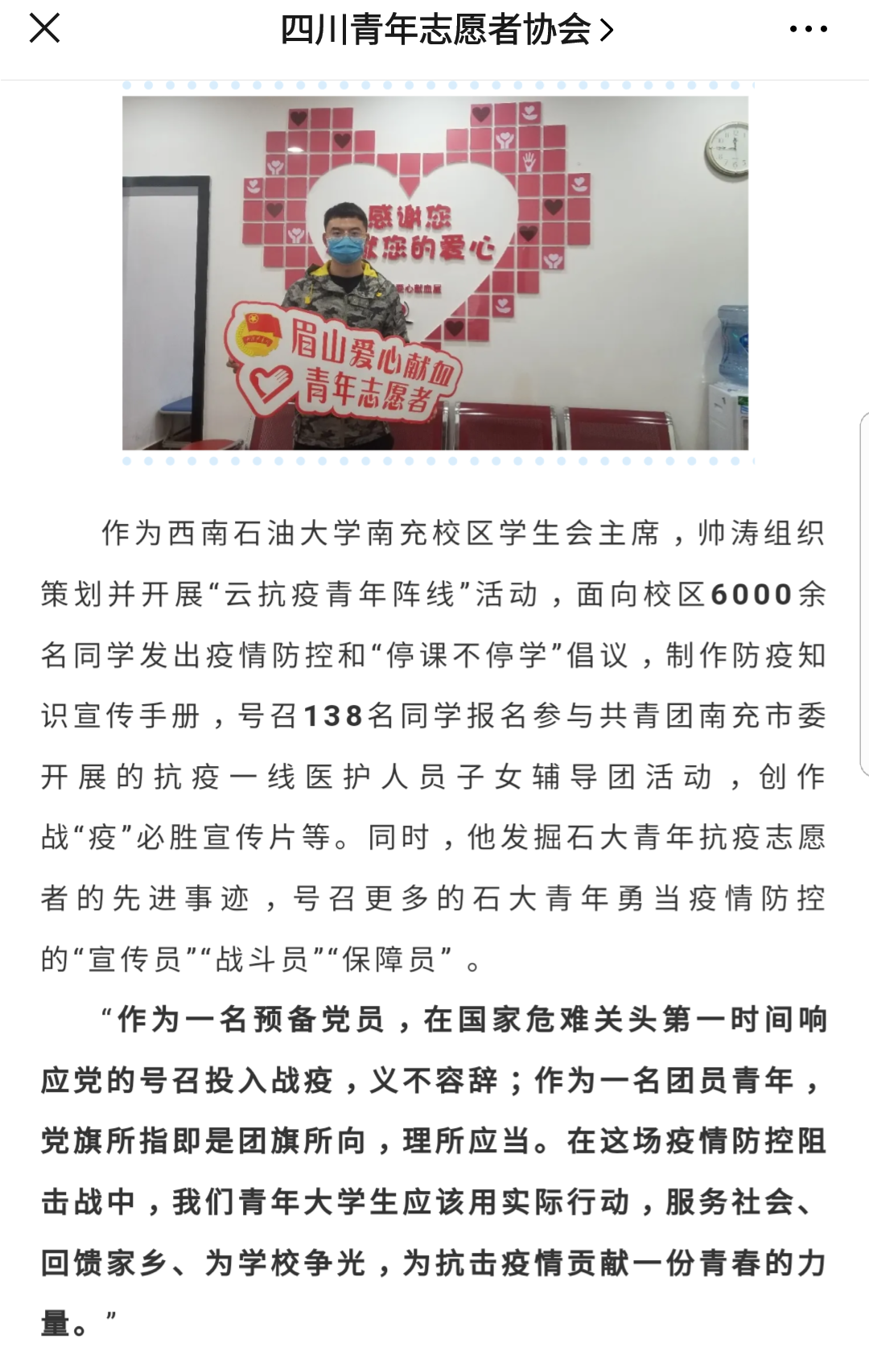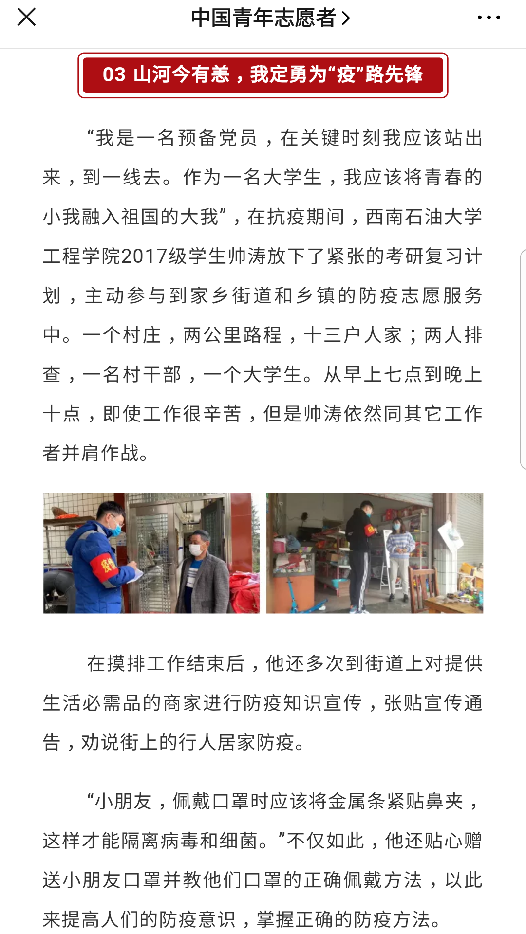 据报道,南充校区工程学院2017级机械电子工程帅涛同学,作为中共预备党员,在国家危难关头响应党的号召投入战“疫”工作,协助社区开展人员排查、防控知识宣传等;作为校区学生会主席,凝聚校区学生干部力量,开展“云抗疫青年阵线”系列活动,号召同学们战“疫”期间做好自身防控工作,并积极参加线上志愿活动。用实际行动,服务社会、回馈家乡、为学校争光,为抗击疫情贡献一份青春力量。