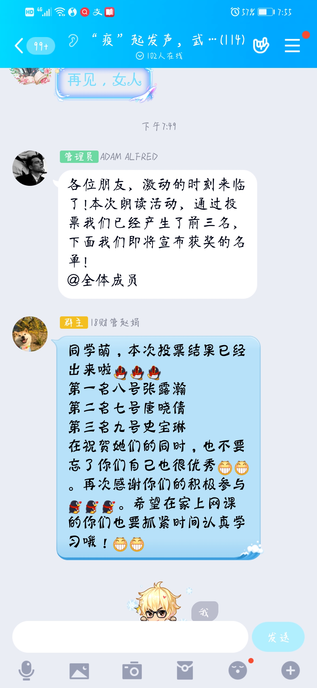 考虑到当前的疫情情况,活动仍是线上开展。活动参与者需要在活动群内提交自己的朗诵作品,内容以助力武汉为主题。提交截止后,由理事整理评选出十个优秀作品,分享在交流群中,由群内观众在优秀作品中投票选出自己心仪的作品,排名前三的参赛同学可以获得精美奖品。活动最后,获得前三名的参赛选手依次是:2019级材料化学张露瀚同学、2018级数字媒体技术唐晓倩同学、2019级信息管理与信息统计史宝琳同学。