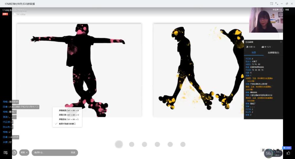 本次活动主要分为视频学习与趣味小游戏两大部分。活动一开展便得到同学们的积极响应。活动开始,首先组织参与者观看轮滑表演视频,同学们积极提问,认真记忆视频中的高频知识点。观看过程中,不少同学在群内进行了动作技术交流。活动中穿插了猜歌环节和你画我猜两个趣味小游戏,缓解答题疲劳的同时增添了活动乐趣,并全程由协会理事记录分数并进行统计。本次活动前三名分别是米蒙同学、谭忠贤同学和张友川同学。