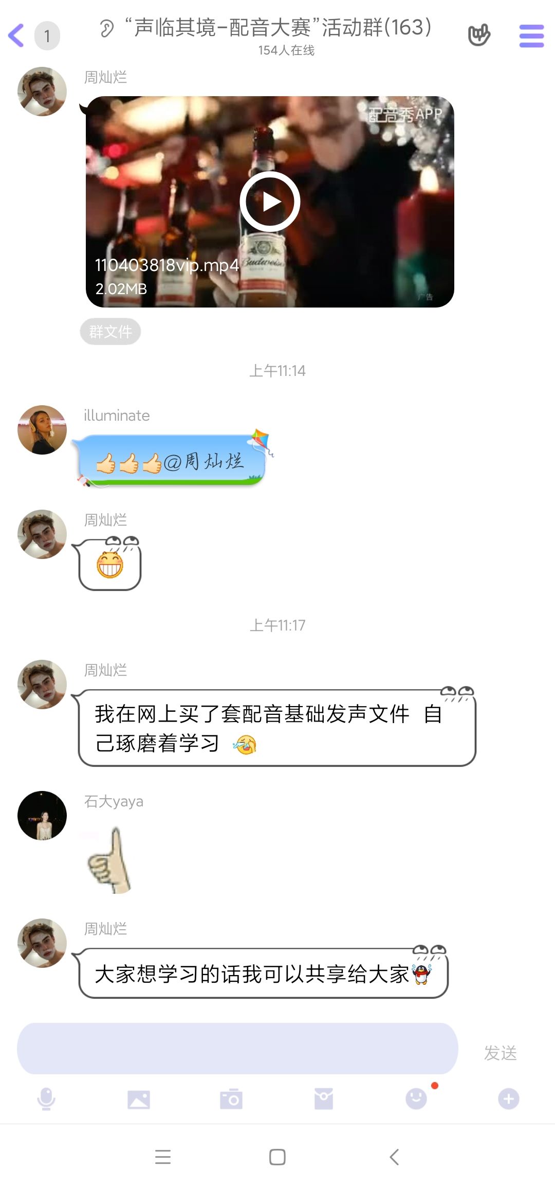 活动期间,参与者们可以任选配音app为自己喜欢的影视片段配音,配音语言与形式不限。配音完成后,参赛者将作品发布于交流群中,协会负责人组织群内成员参与讨论。在活动过程中,各位配音爱好者大显身手,分享了丰富多样的优秀配音作品。参与者们在群内认真学习,积极讨论,学到了不少配音技巧,配音技术也得到了很大的提升。
