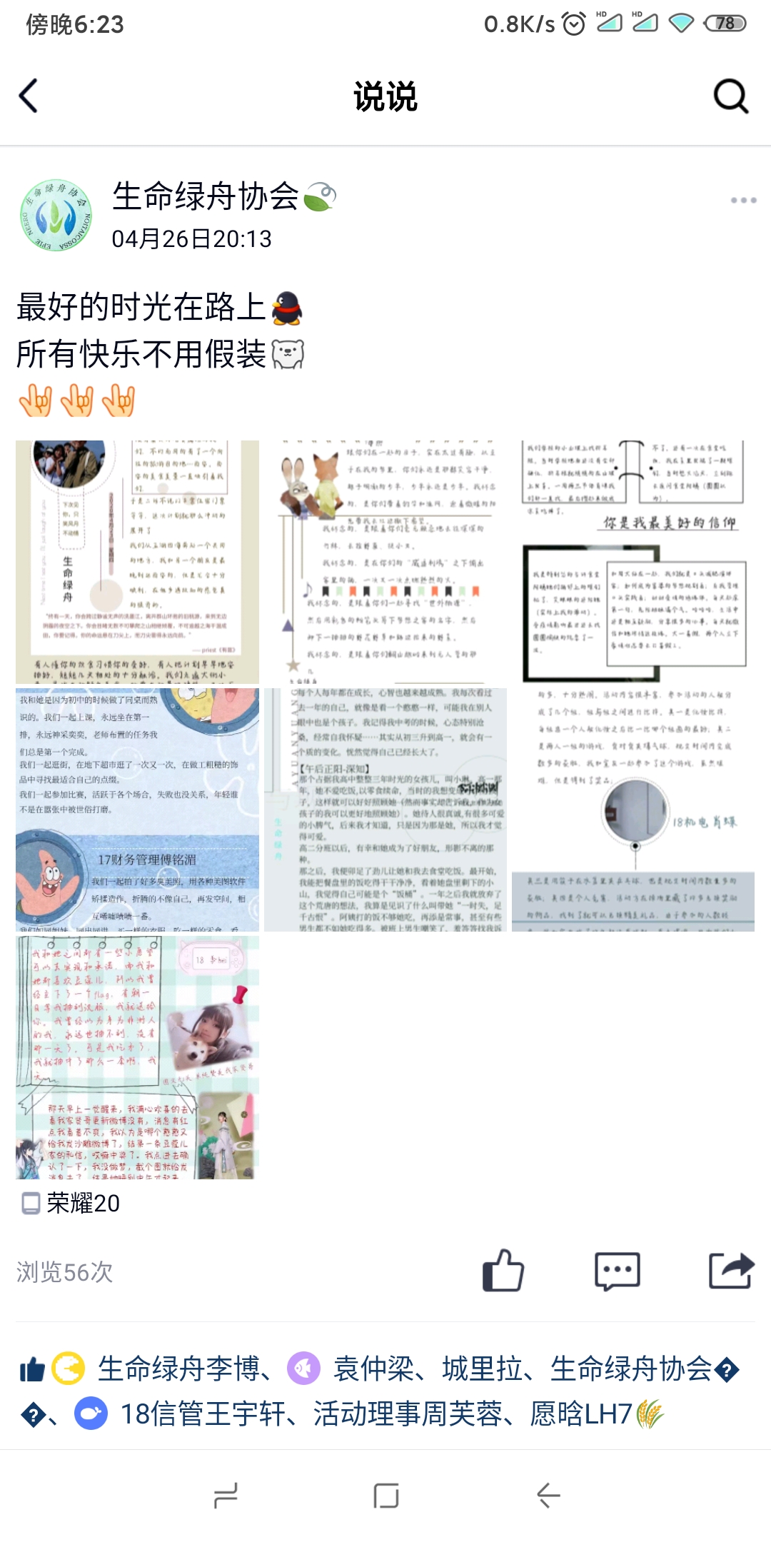 在此次活动中,参赛者用文档的形式,分享和朋友之间发生的故事或者有纪念意义的照片,投稿至生命绿舟协会官方邮箱。由协会负责人收集整理作品后,在官方QQ上展示分享。各年级同学积极参与、认真对待,向大家分享了很多令人暖心的回忆,一个个小故事,一次次小摩擦,都是情谊的见证,让同学们感受到了友谊的力量。