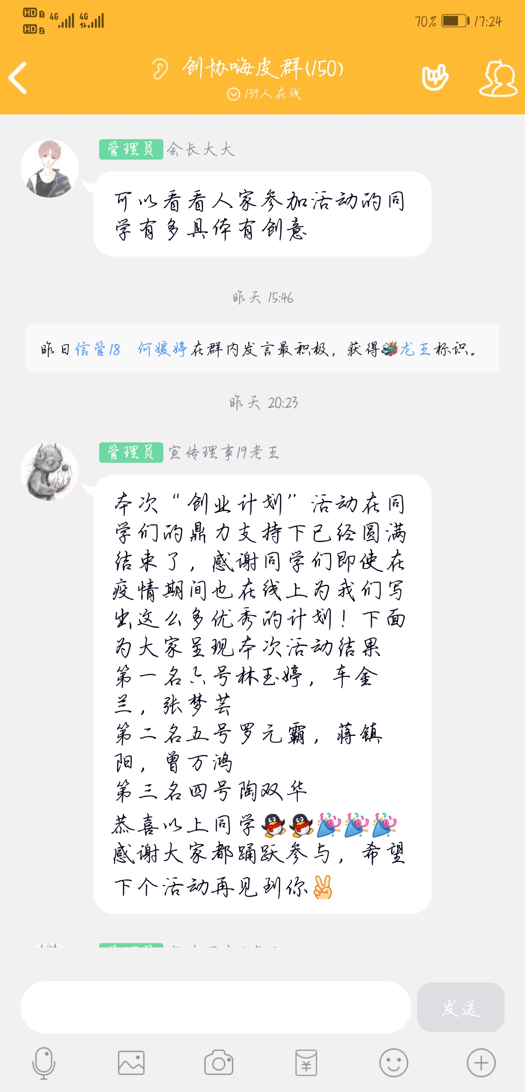 本次活动以“实践竞赛,未来等你”为主题,提出了“创业的起步,从迈出计划的第一步开始”的活动思想。参赛人员在规定时间内,按要求将创业计划书以电子档形式发送给指定人员。工作人员结合计划书的规定要求和创新力度等方面,综合考虑后,评选出三份优秀计划书。经过大众评选投票,最终由六号林玉婷、车金兰、张梦芸的《大学生创业计划书—校园百宝箱》获得一等奖;五号罗元霸、蒋镇阳、曾万鸿的《大学生创业计划书—美食岛》获得二等奖;四号陶双华的《大学生创业计划书—美味多面包哄吧》获得三等奖。奖品将以邮寄的方式送至获奖者手中。