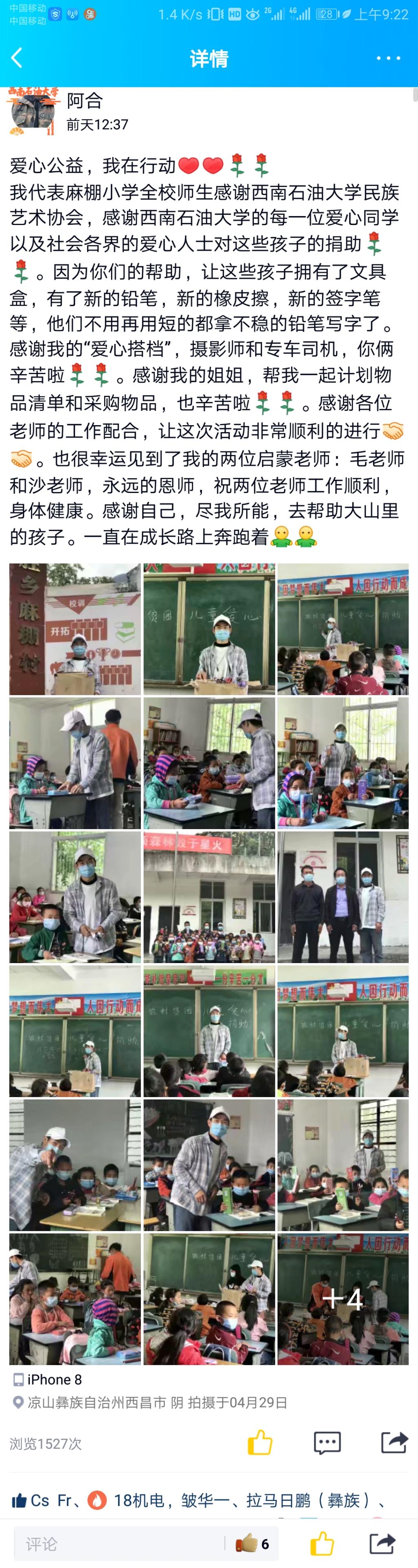 活动后,阿尔阿合向主办方传达了山区老师的感激之情:“很感谢民族艺术协会和同学们!多亏了他们,孩子们不必用短到拿都拿不住的铅笔写字了!”对此,民族艺术协会会长也表示:“我从大山里走出来,对孩子们的遭遇感同身受,希望通过这个活动,可以呼吁社会更多的人关注到少数民族孩子的学习现状!传递爱心,温暖凉山。”