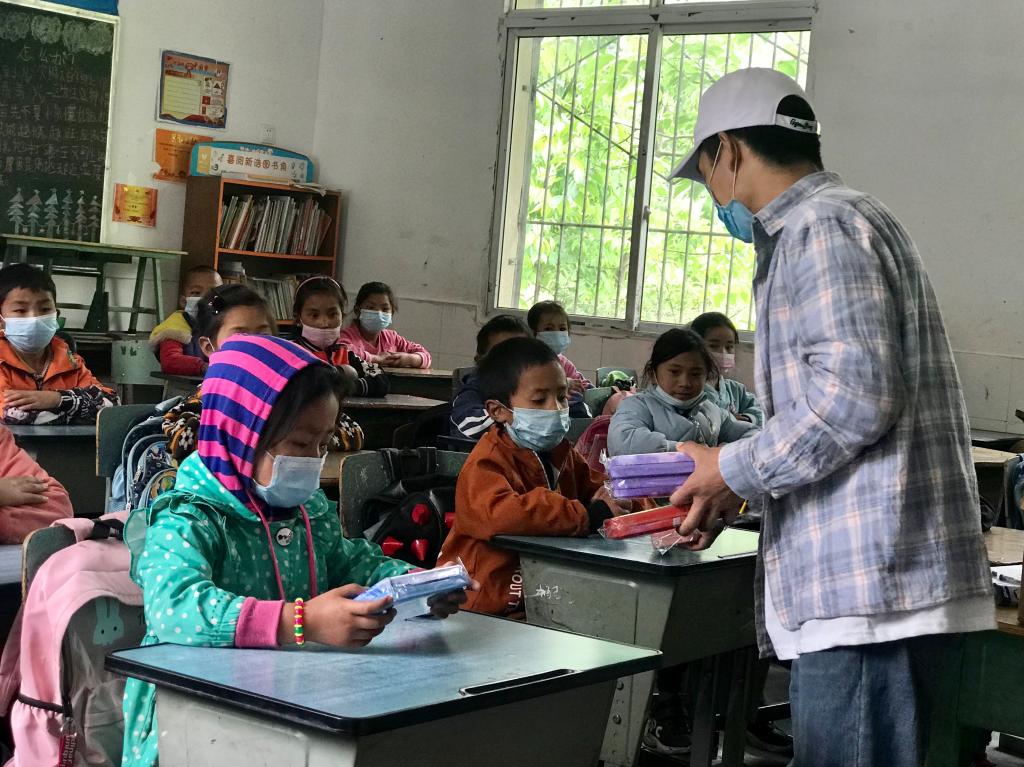 “同学们,看看哥哥带什么东西来了!这些是哥哥学校里的社团——民族艺术协会和很多哥哥姐姐们一起为你们买的口罩和新文具!”大凉山麻棚小学中孩子的早课才刚刚开始,南充校区大四学生阿尔阿合以及凉山山区小学的两位老师便抱着捐赠文具走进了教室,一一分发。孩子们拿着新的文具盒、铅笔和口罩等物品,都欢呼起来,一个劲的说:“谢谢阿尔阿合哥哥!谢谢民族艺术协会的哥哥姐姐们!”