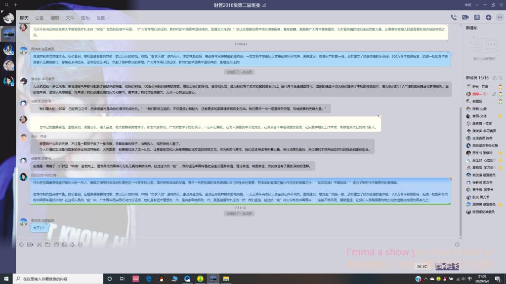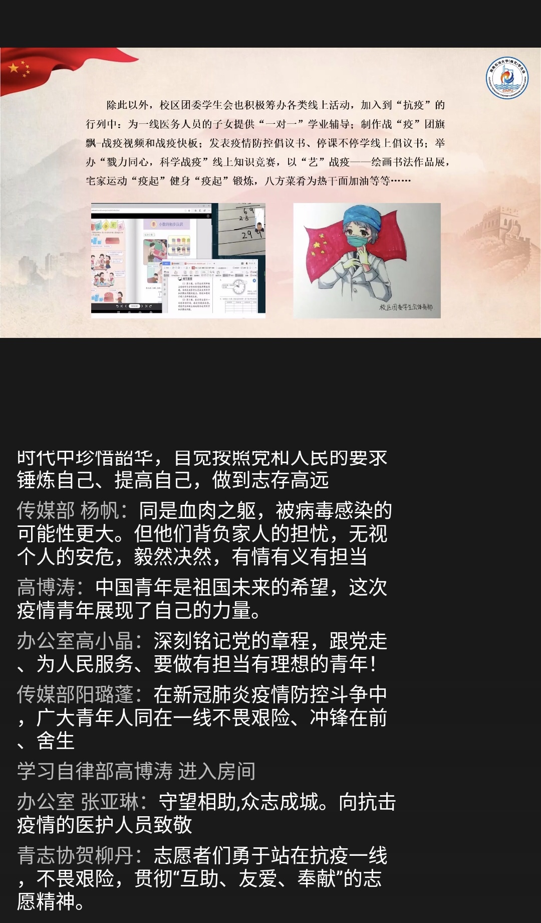 近日,校区团委及各学院团学青年深入学习了习近平总书记给北京大学援鄂医疗队全体“90”后党员的致电回信。信中,总书记对新时代青年党员不惧困难、不畏艰险、冲锋在前、舍身忘死的精神提出明确表扬,并鼓励广大青年砥砺意志品质,投身强国伟大事业。