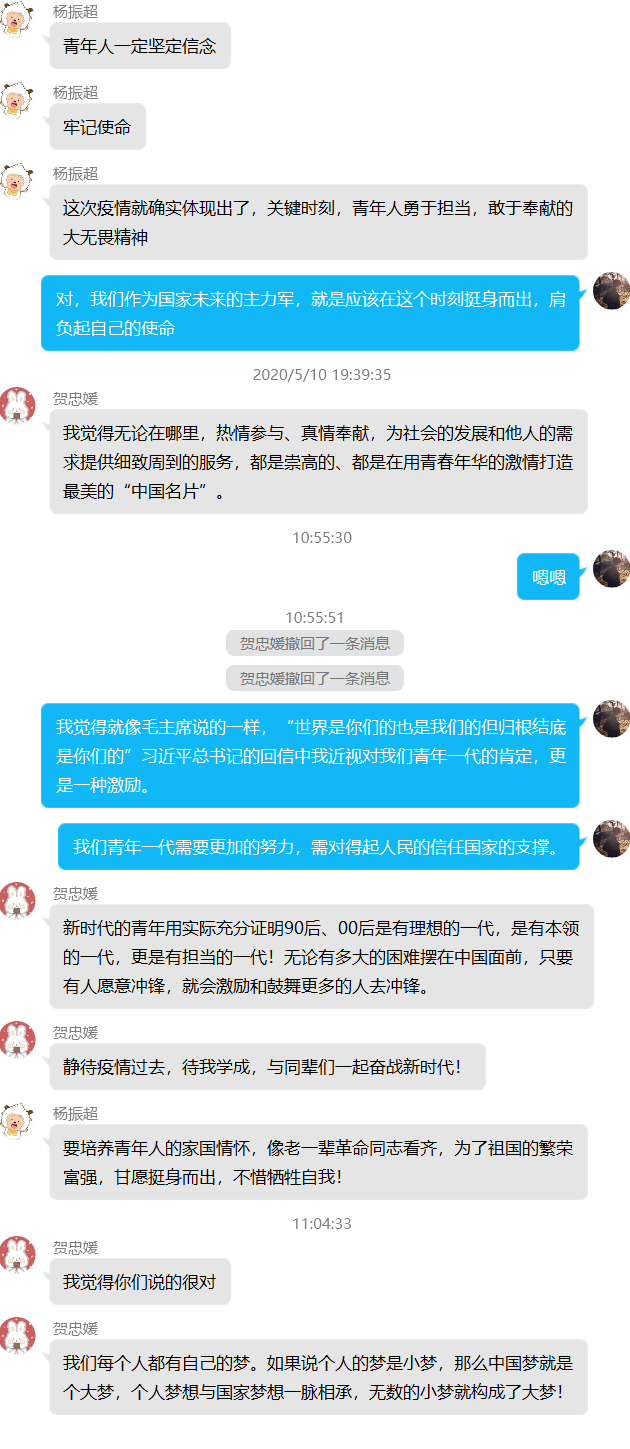 财经学院财务管理2018级贺柳丹则深受“回信精神”激励:作为青年志愿者协会副会长以及一名石大志愿者,我也将在习近平总书记回信精神激励下,秉承“互助、友爱、奉献”的志愿精神,积极组织参加各种志愿活动,做到“越是艰难越向前,我们广大青年要用行动证明,新时代的中国青年是堪当大任的!”