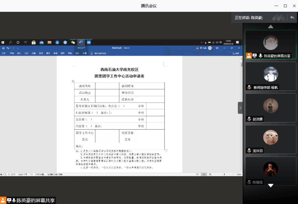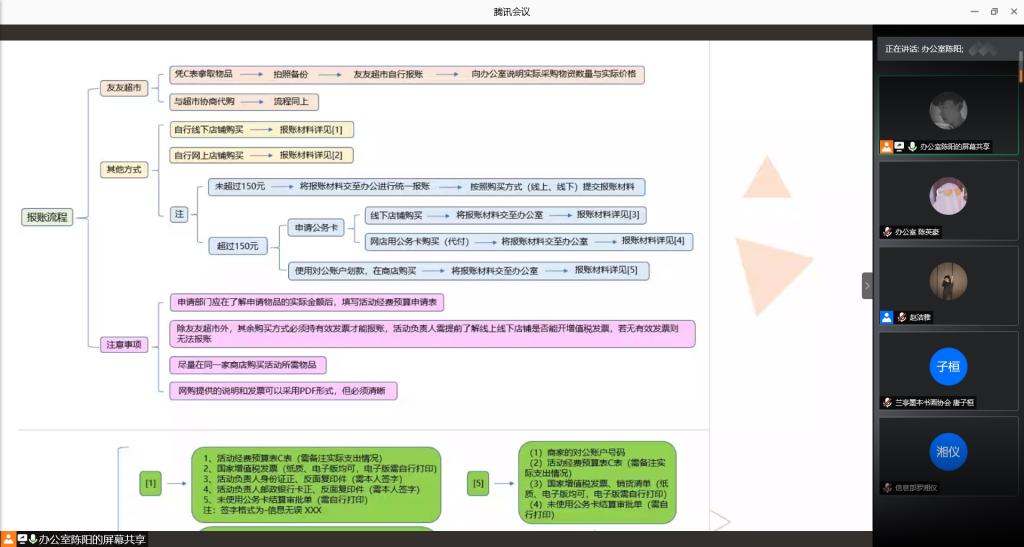 此次培训以“腾讯会议”为平台,主要围绕报账流程、新闻稿撰写及其申请流程、各组织部分表格的申请流程等三个方面展开。在培训过程中,团学工作中心办公室副主任陈阳向同学们讲解了具体的报账流程和注意事项,以及日常工作中可能会遇到的问题及解决方法,让同学们更加深入理解、熟悉报账流程。青年传媒中心新闻宣传部副部长廖静准确地讲解了新闻稿的特点与格式要求,并针对会议、活动、赛事、讲座等不同类型的新闻稿进行了分析。最后,团学工作中心办公室副主任陈英豪简明扼要地讲述了团委各组织部分表格的申请流程、细化流程。