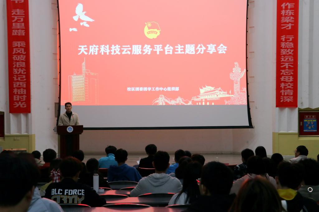 为深入贯彻落实党的十九届五中全会精神,进一步推动天府科技云的注册工作,激发校园创新活力,助力高质量发展。11月18日晚,校区团委团学工作中心于第四教学楼多功能学术报告厅举办了“天府科技云”主题宣讲会。南充市科协党组成员、副主席尹晓辉,南充市科协学会部部长卢奇,南充市院士(专家)、服务中心主任彭靖担任主讲人,南充市顺庆区科协主席汪勤修,南充市顺庆区科协主任韩画出席。校区团委老师李啟祥主持大会,各专业团支书参与会议。