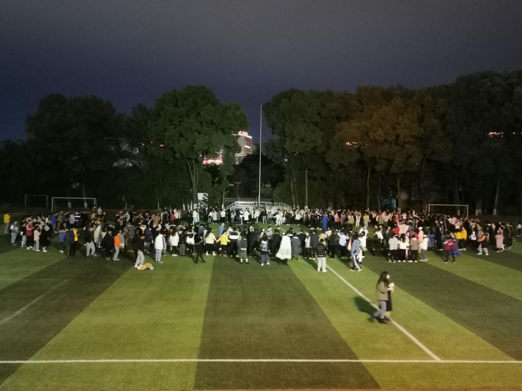 晚会结束后,全员转场至足球场欢跳达体舞。老师与同学们一起手牵手围成圈,共跳达体舞,场面十分热闹欢快。21:45音乐停止,第五届彝历新年晚会在民族舞曲中落下帷幕。